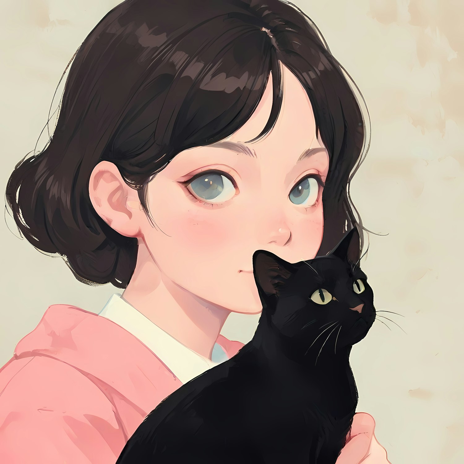 Charming illustration of a young woman with blue eyes holding a black cat. Soft colors and delicate details create a serene atmosphere.