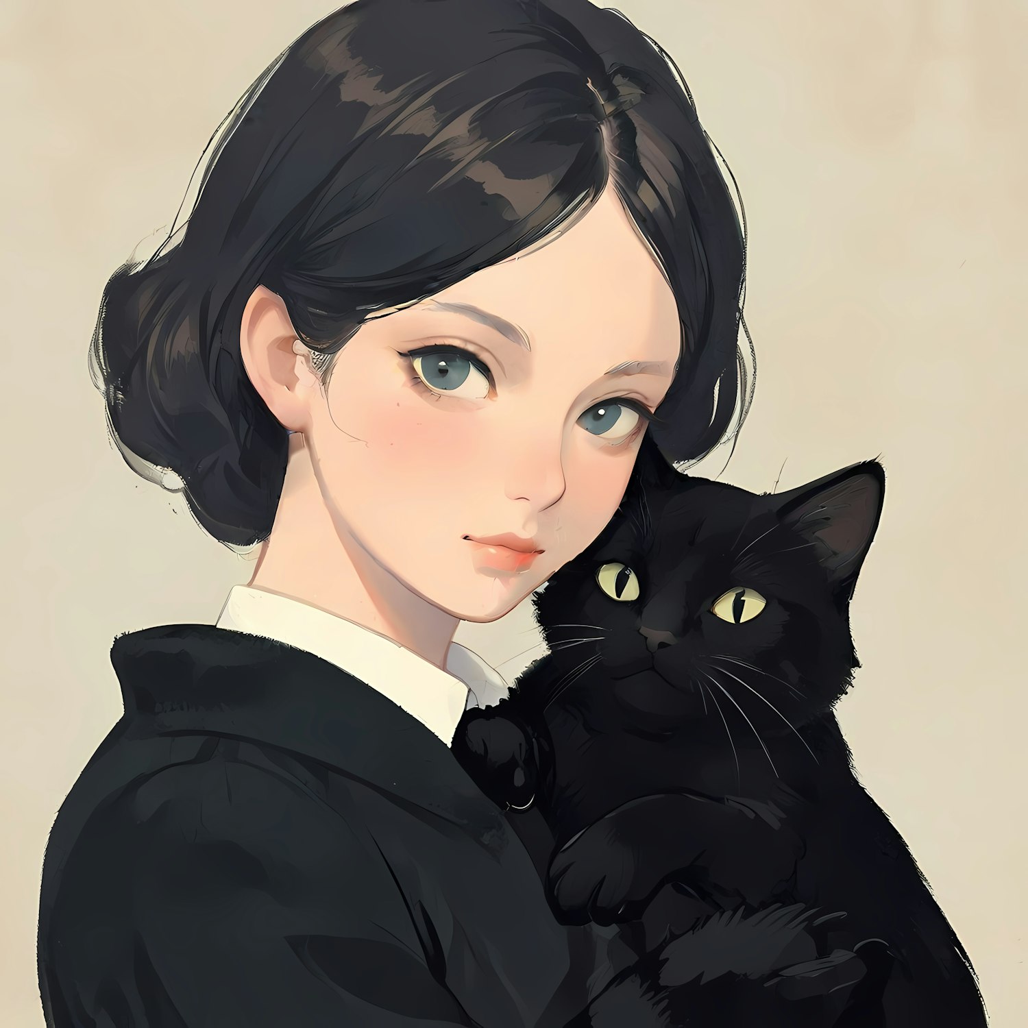 Elegant illustration of a woman with dark hair holding a black cat. Both have striking eyes, set against a soft beige background.