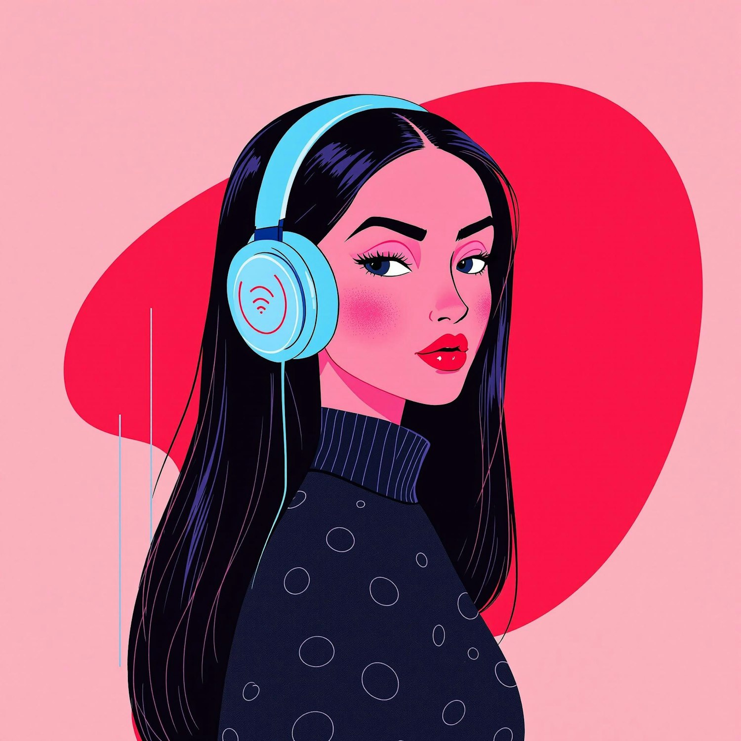 Stylish illustration of a woman with blue headphones and vibrant colors, showcasing trendy polka dots and a modern aesthetic.