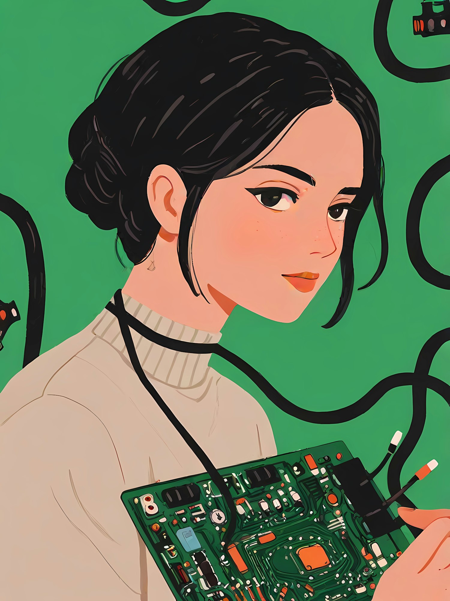 Stylized illustration of a woman holding a circuit board with cables, set against a green background. Modern and tech-inspired art.