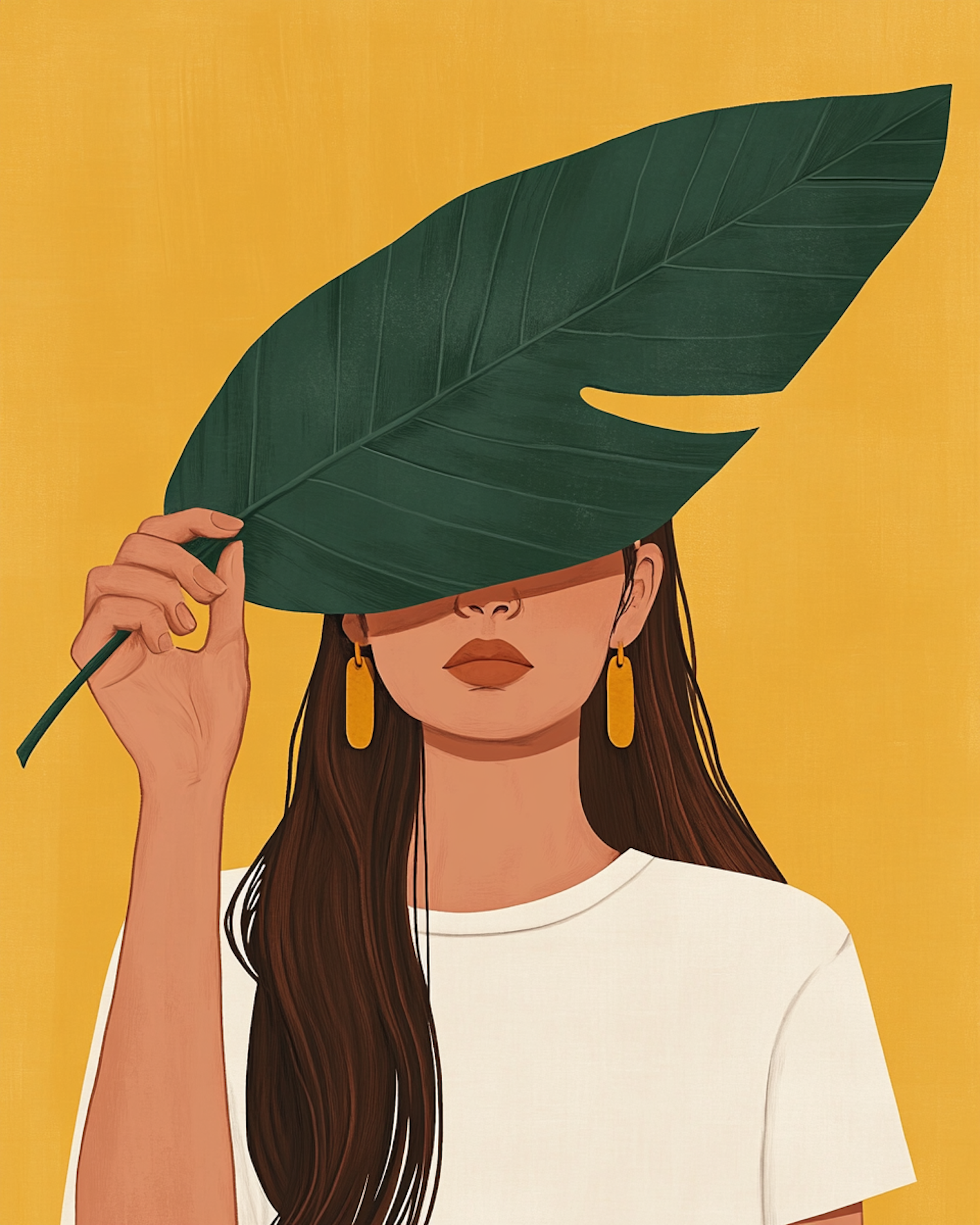 Illustration of a woman holding a large green leaf, obscuring her face, against a bright yellow background. Bold and colorful design.