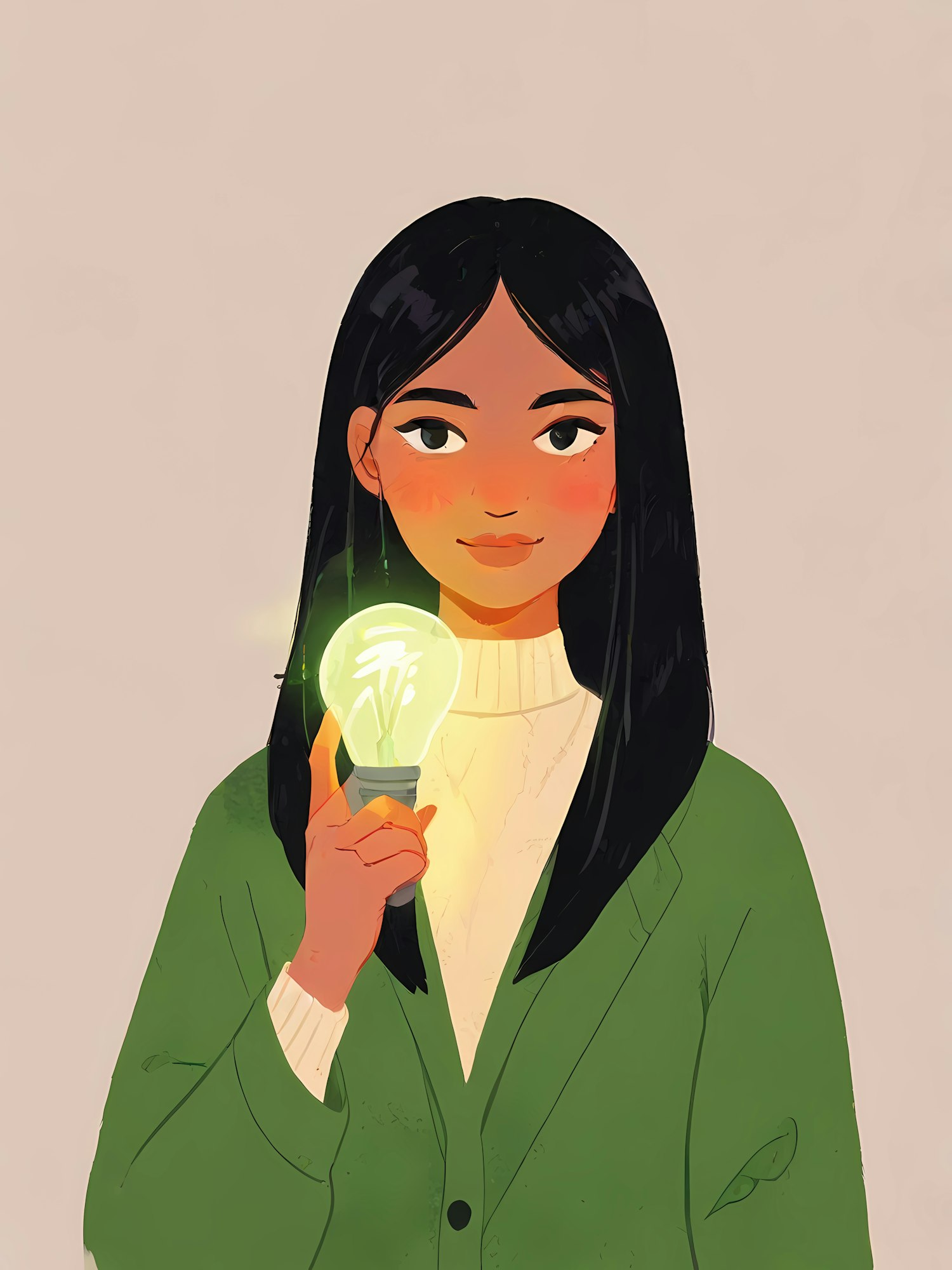 Illustration of a woman holding a glowing light bulb, symbolizing creativity and inspiration. She wears a green jacket and white sweater.