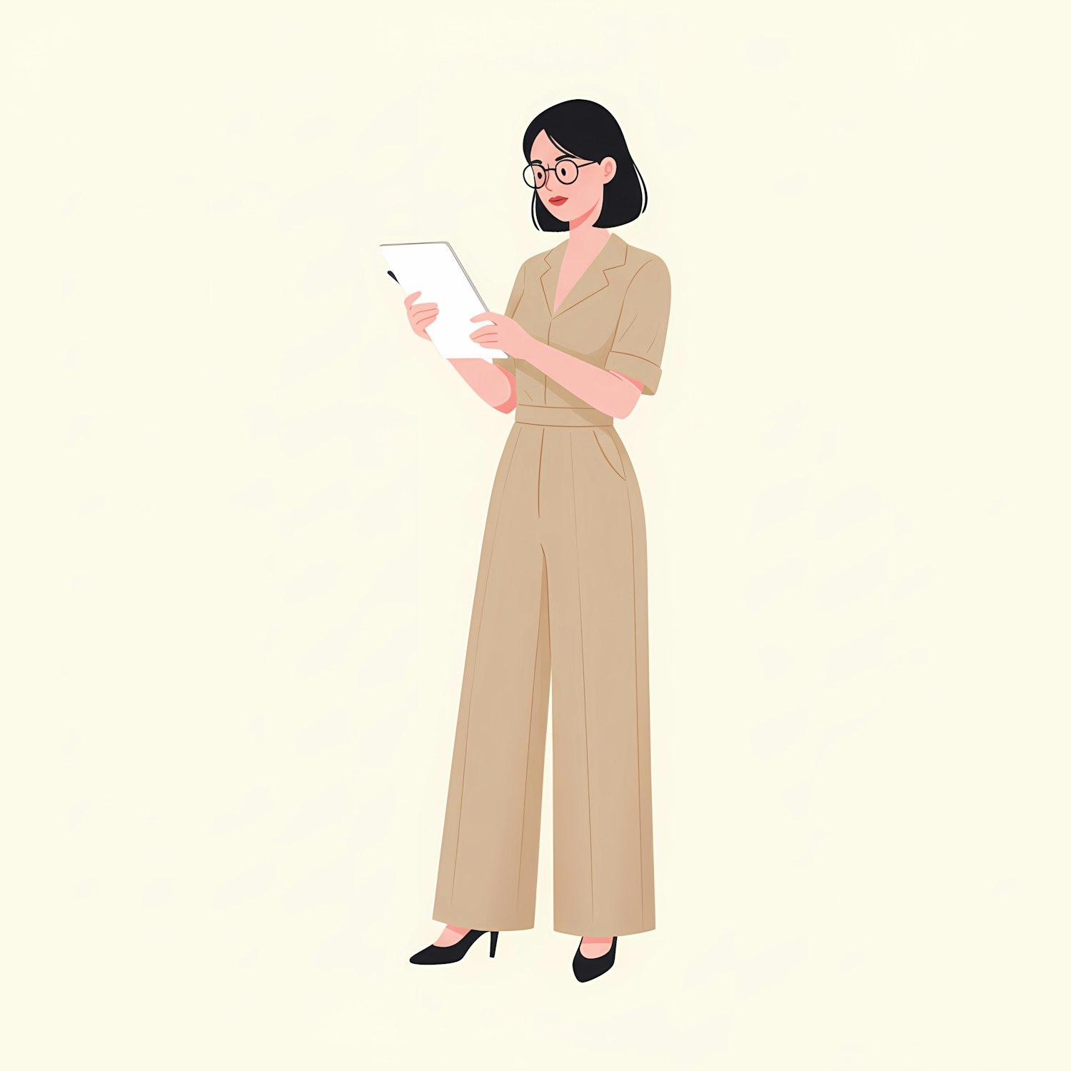 Stylish illustration of a woman in a beige jumpsuit holding a tablet, showcasing modern fashion and technology.