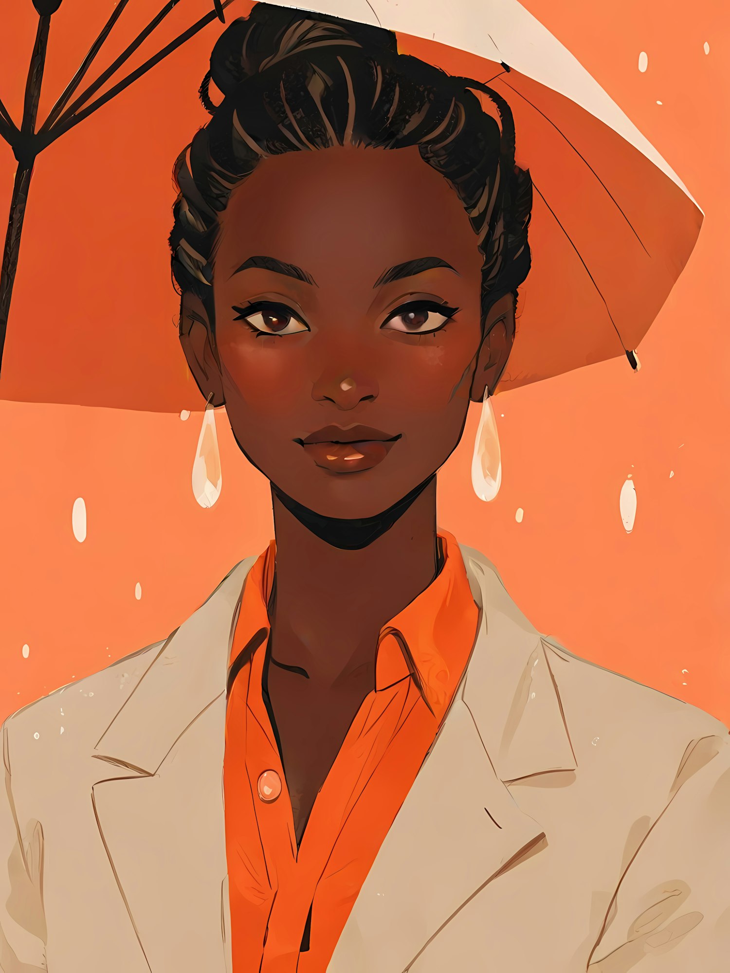 Elegant black woman with an umbrella, wearing a beige blazer and orange shirt against a warm orange background.