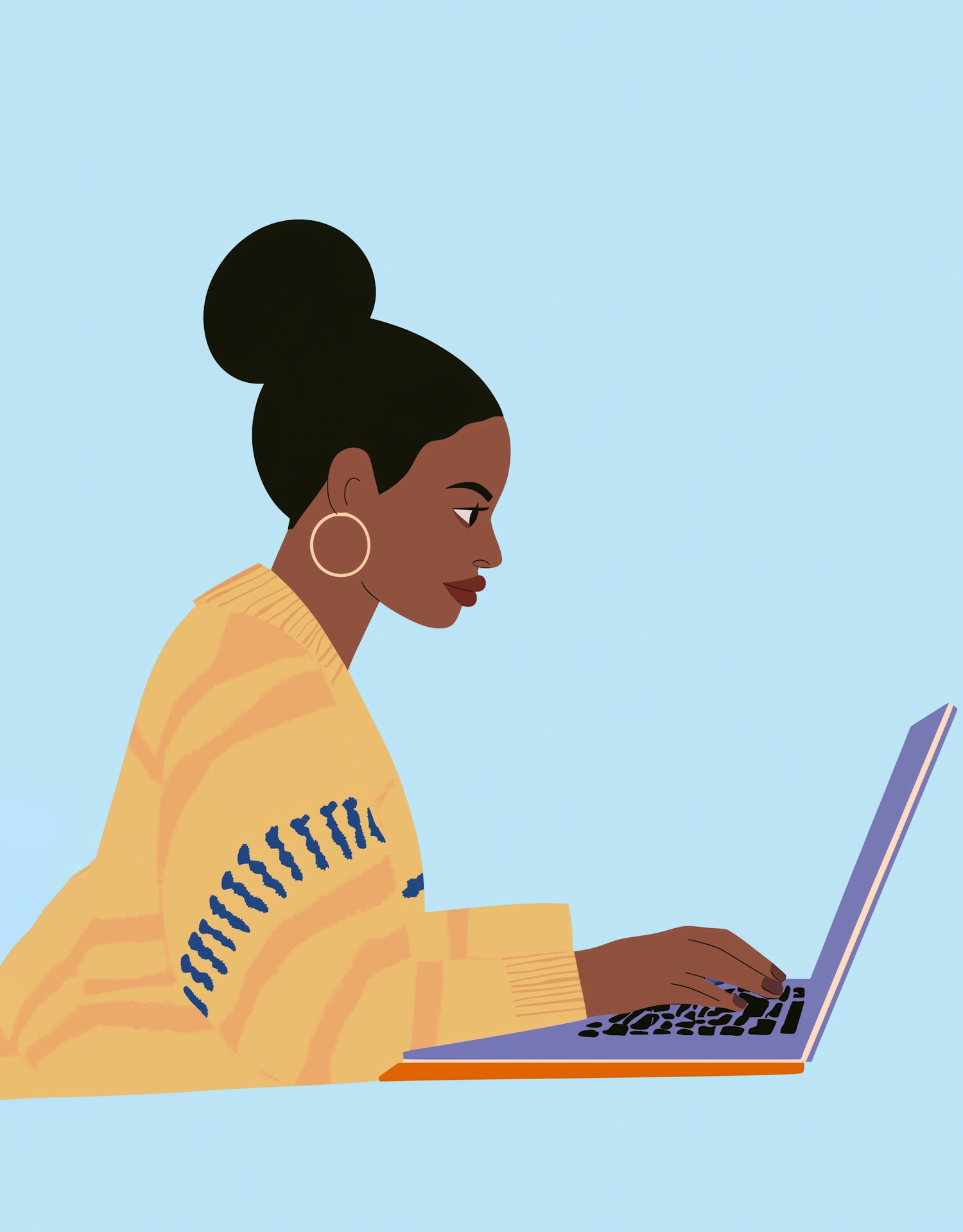 Illustration of a focused woman typing on a laptop, wearing a yellow sweater with blue patterns, set against a light blue background.