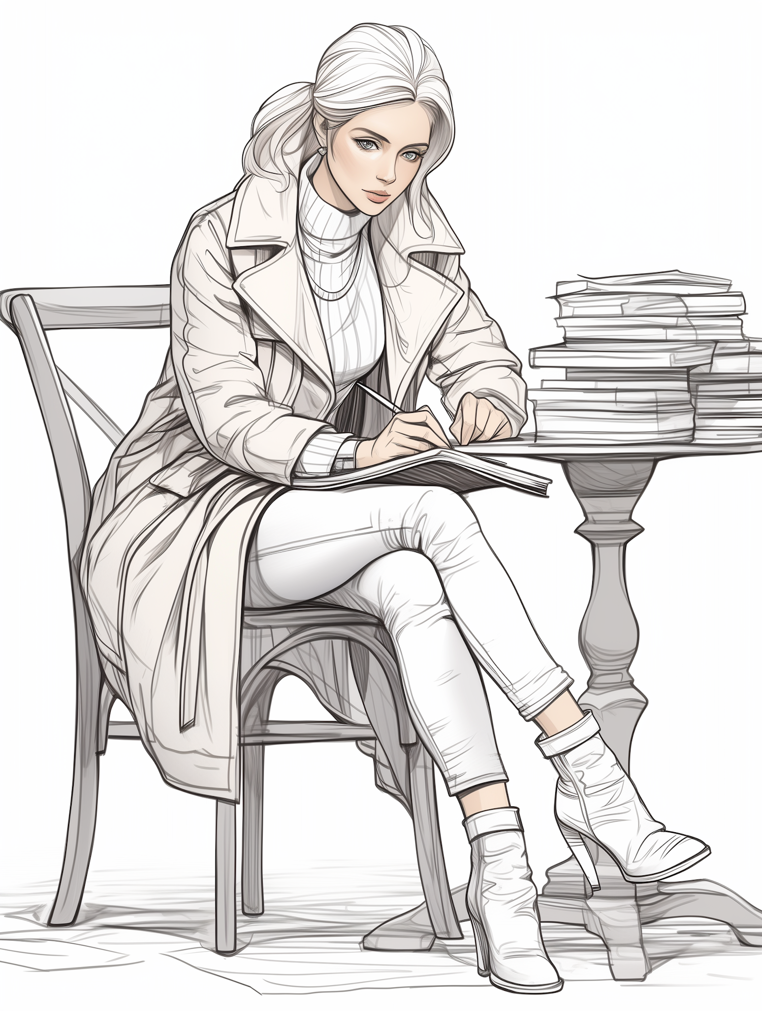 Elegant woman in a trench coat writing at a table with books, showcasing a stylish and focused scene.
