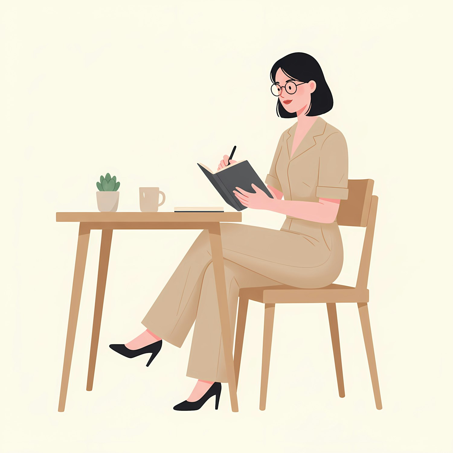 Illustration of a woman writing at a table, with a notebook, coffee mug, and plant, set against a minimalist background.
