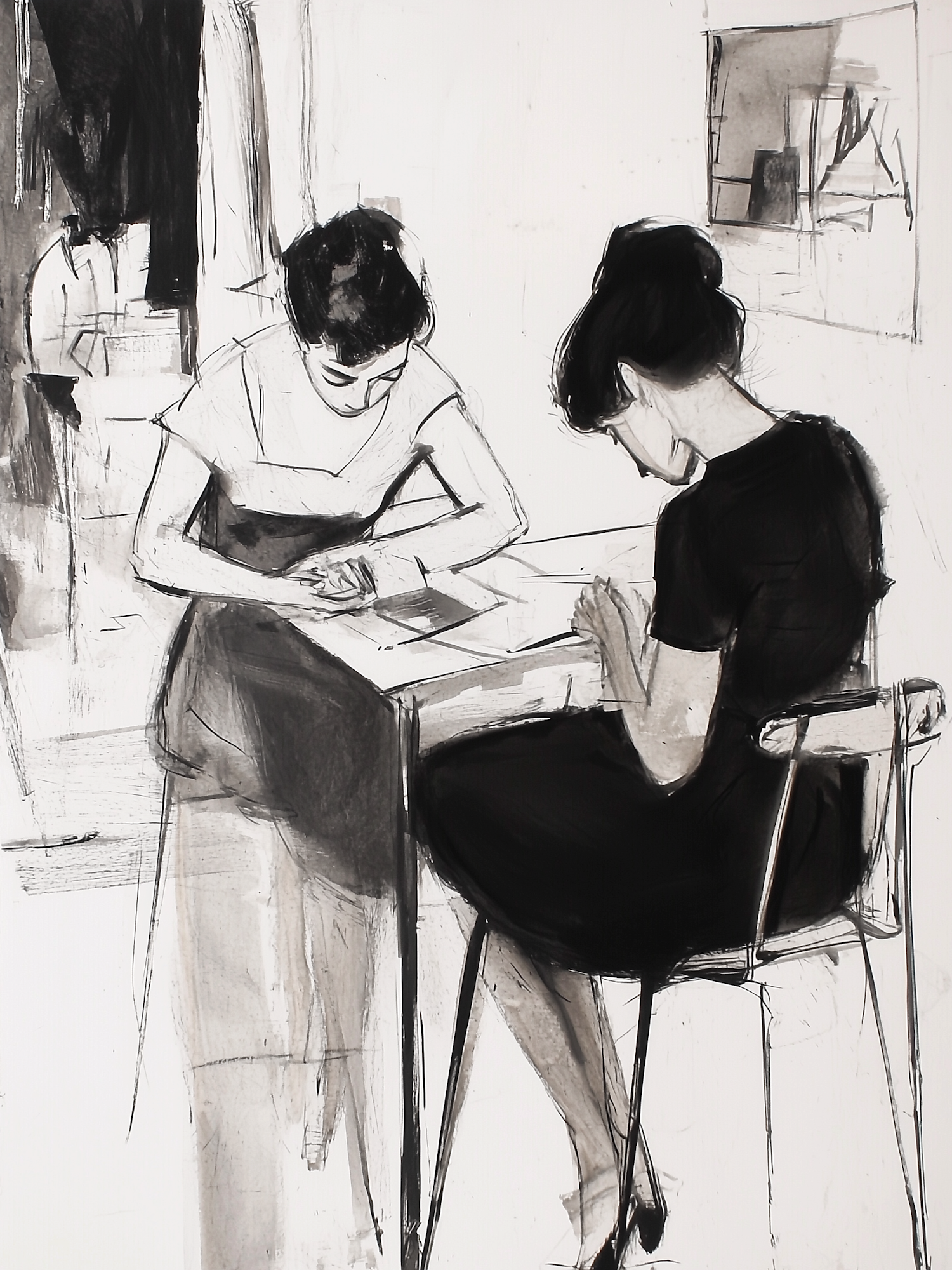 Monochromatic illustration of two women writing at a table, showcasing focus and collaboration in a minimalist style.