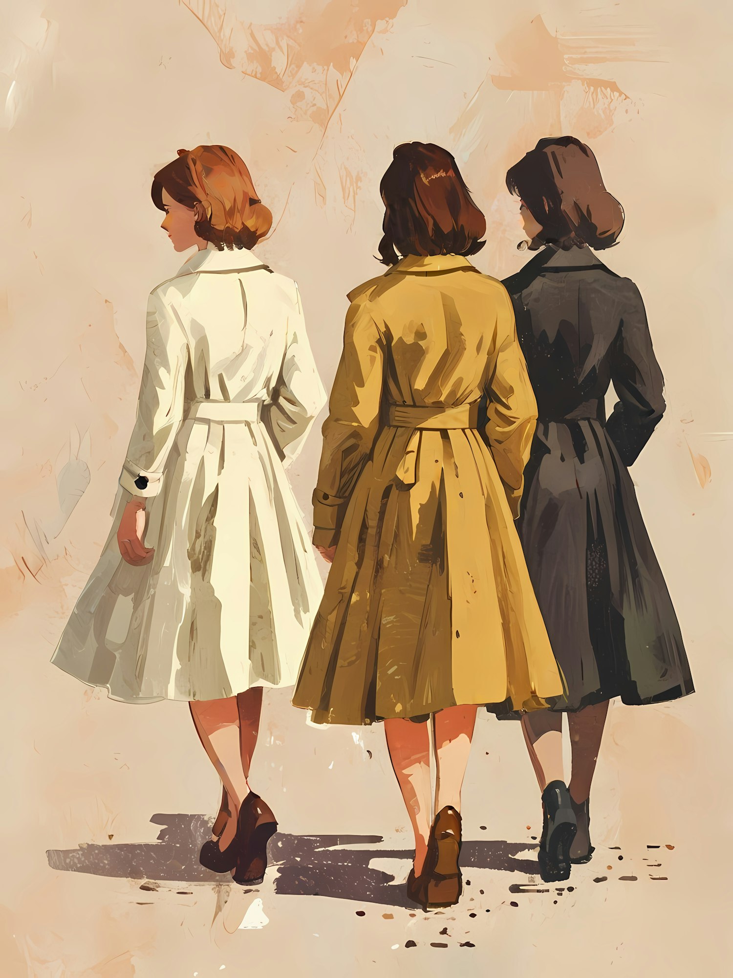 Three women walking in retro-inspired trench coats, featuring glamorous outfits in white, mustard yellow, and black hues.