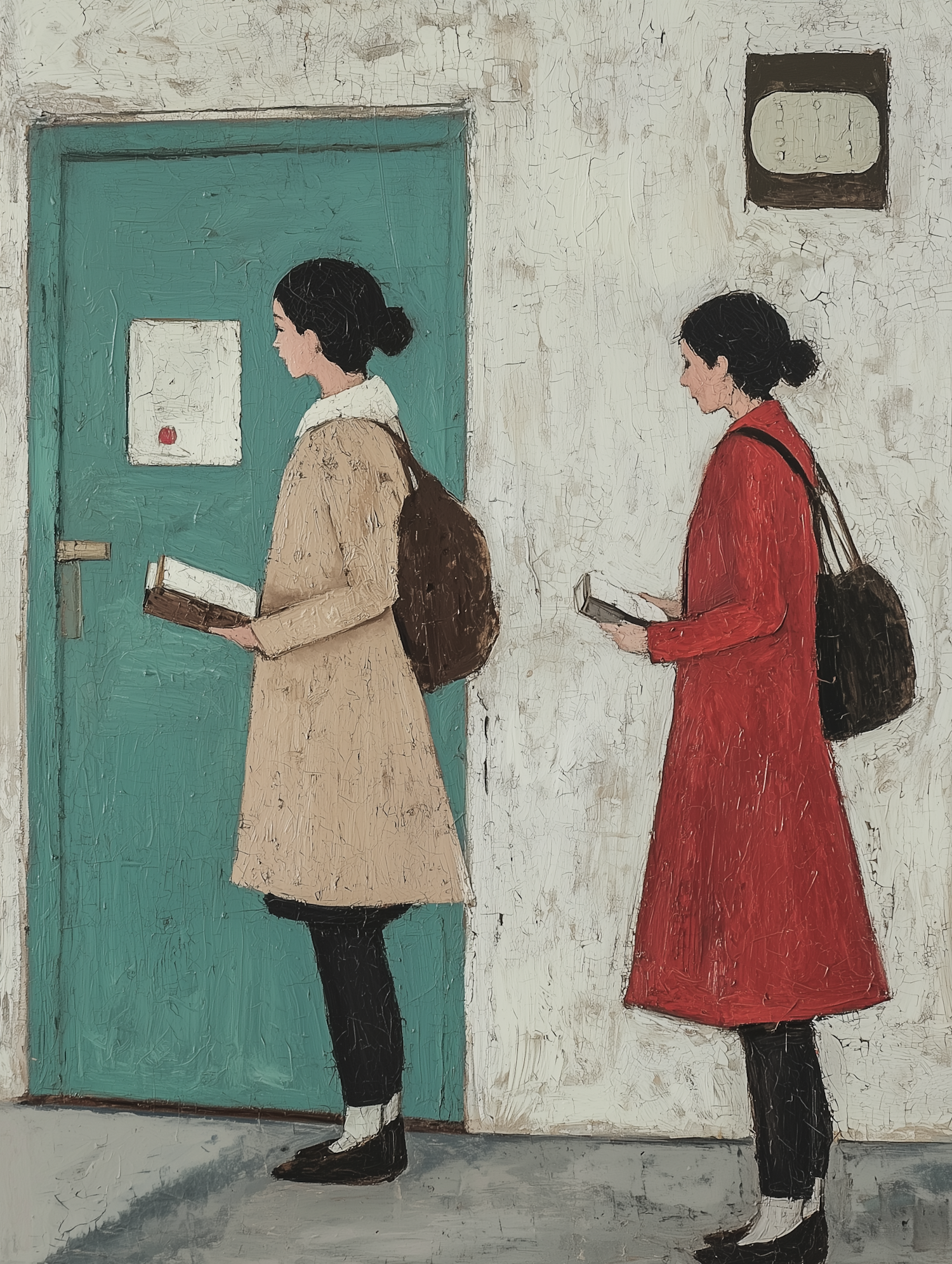 Two women in coats stand in line with books, facing a teal door. The textured wall and muted colors create a serene atmosphere.