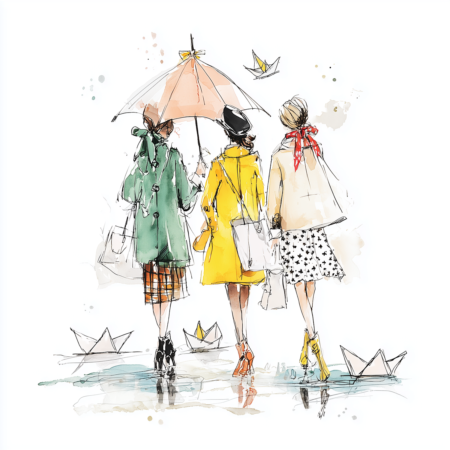 Charming illustration of three women in colorful coats walking with a pink umbrella, surrounded by paper boats on a rainy day.