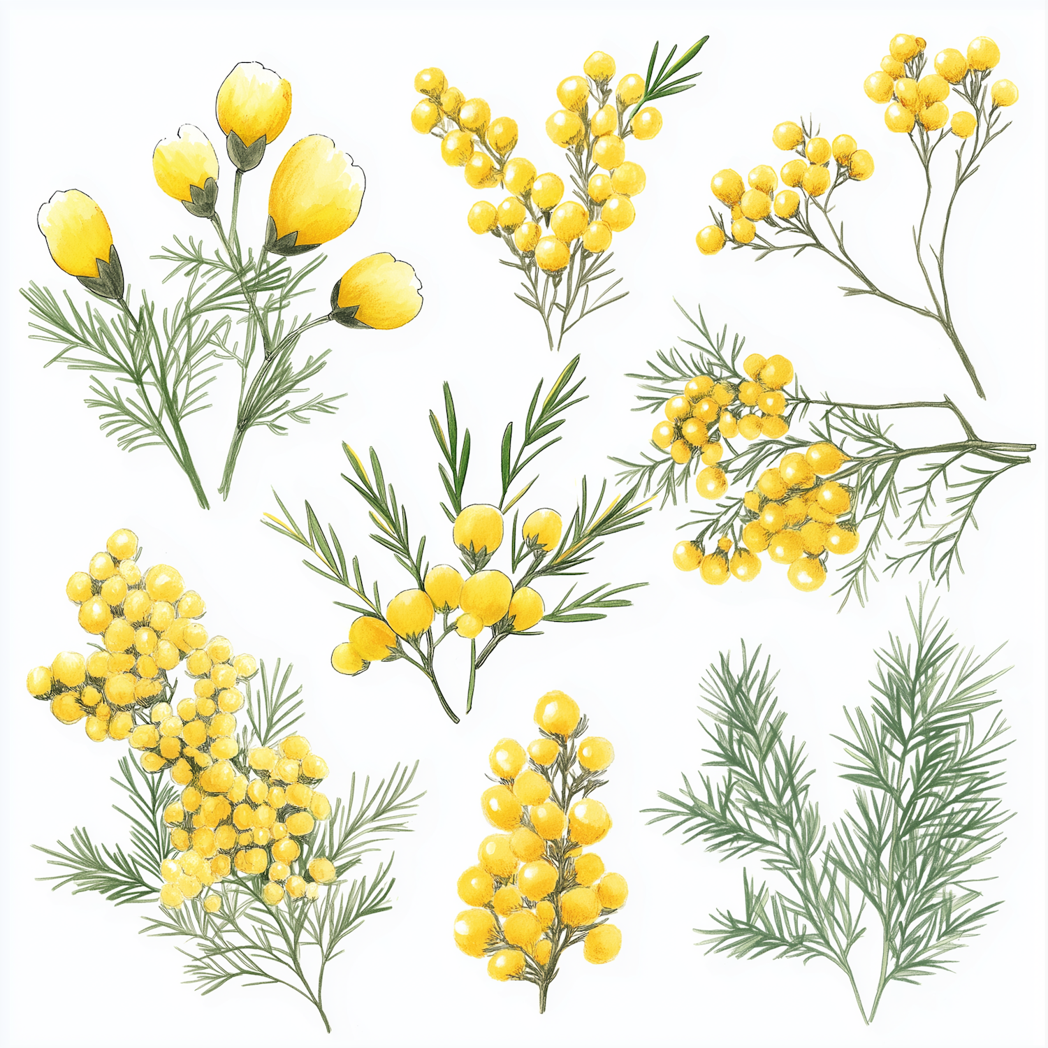 Beautiful botanical illustration of yellow flowers and feathery green leaves, including mimosa-like clusters and bell-shaped blooms.