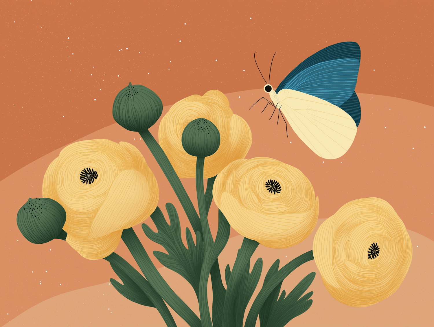 Illustration of yellow butterfly ranunculus flowers with a contrasting blue and cream butterfly against a gradient orange background.