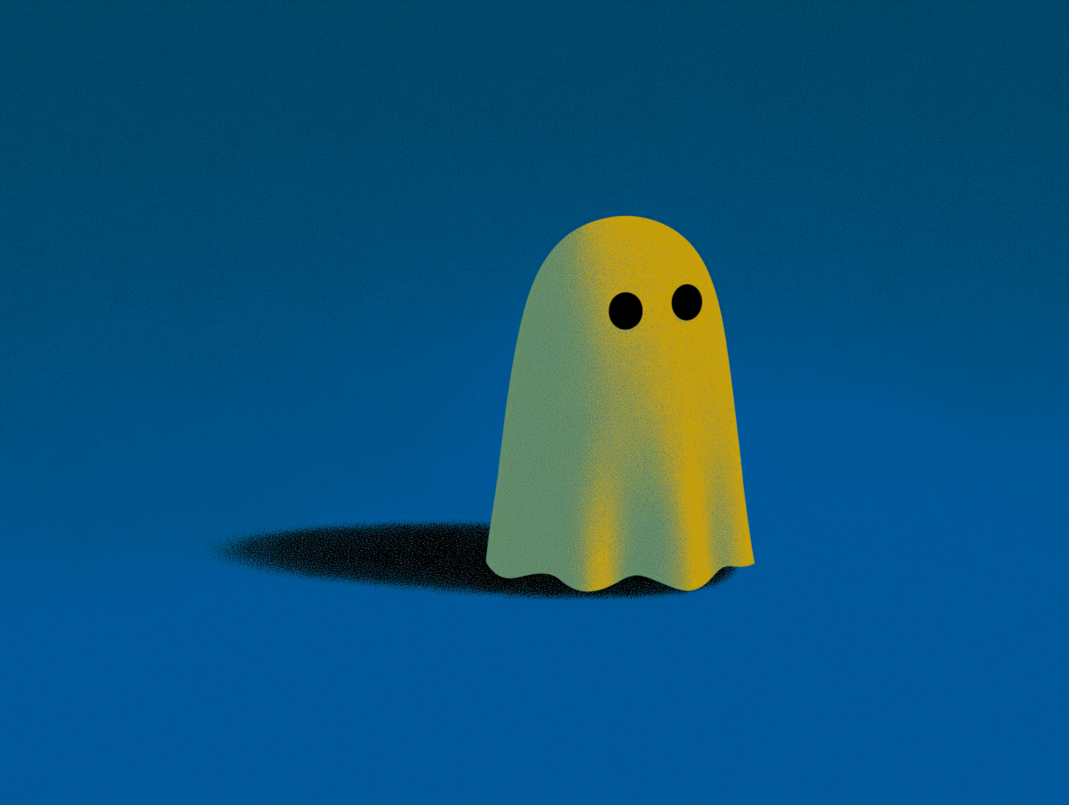 Minimalist illustration of a yellow ghost figure with black eyes on a blue background, perfect for modern and playful designs.
