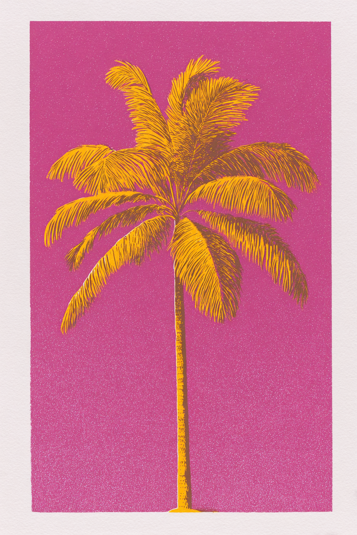 A vibrant illustration of a yellow palm tree against a textured magenta background, radiating tropical vibes and colorful energy.