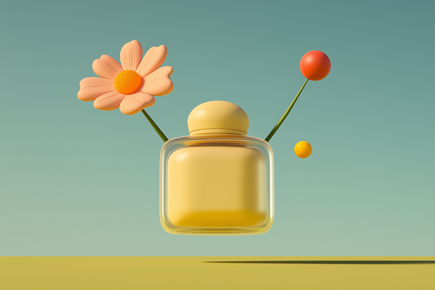 A vibrant 3D illustration of a yellow perfume bottle with floral and spherical accents, set against a teal background and yellow surface.