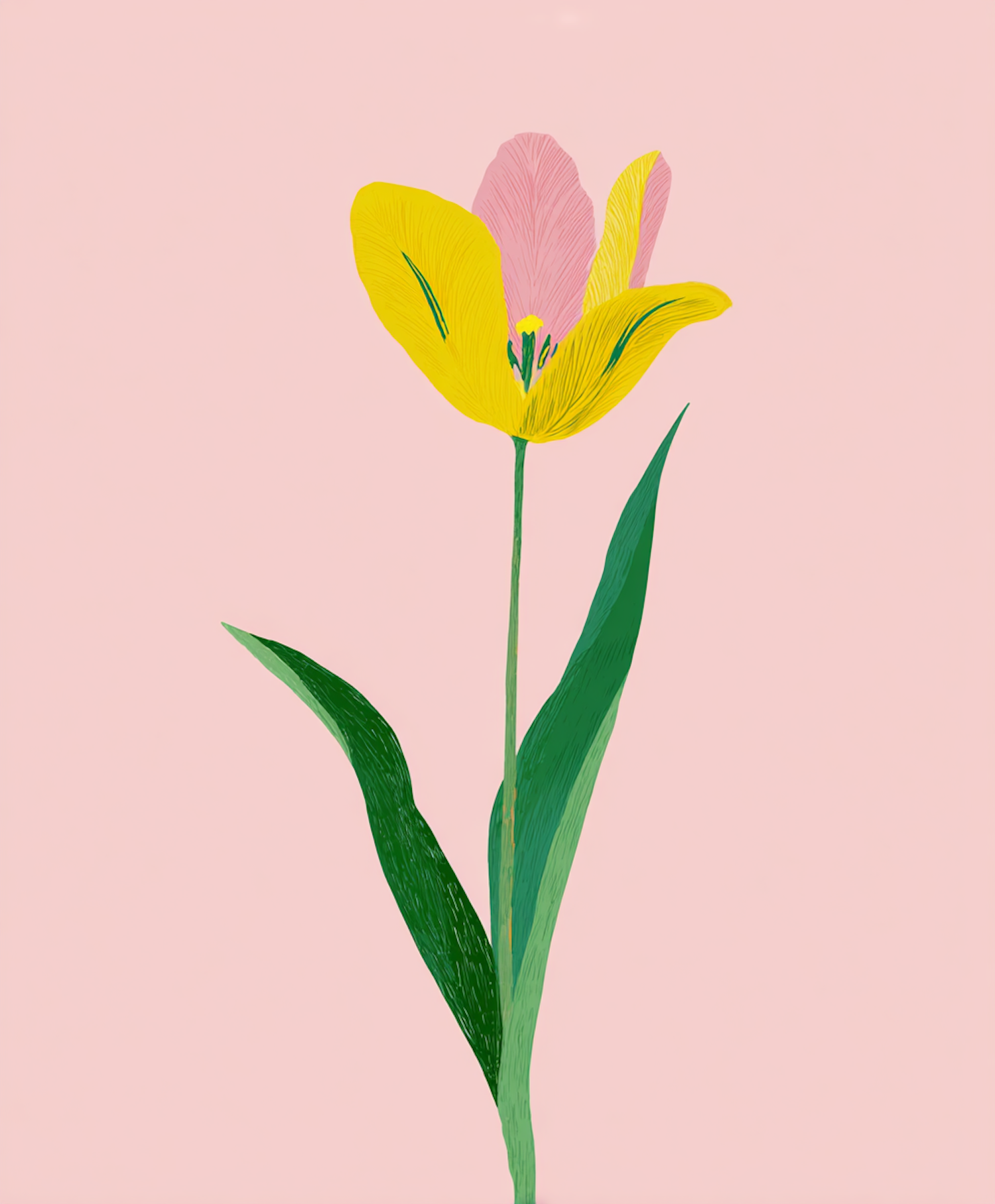 A strikingly simple illustration of a yellow tulip with pink accents against a pastel pink background.