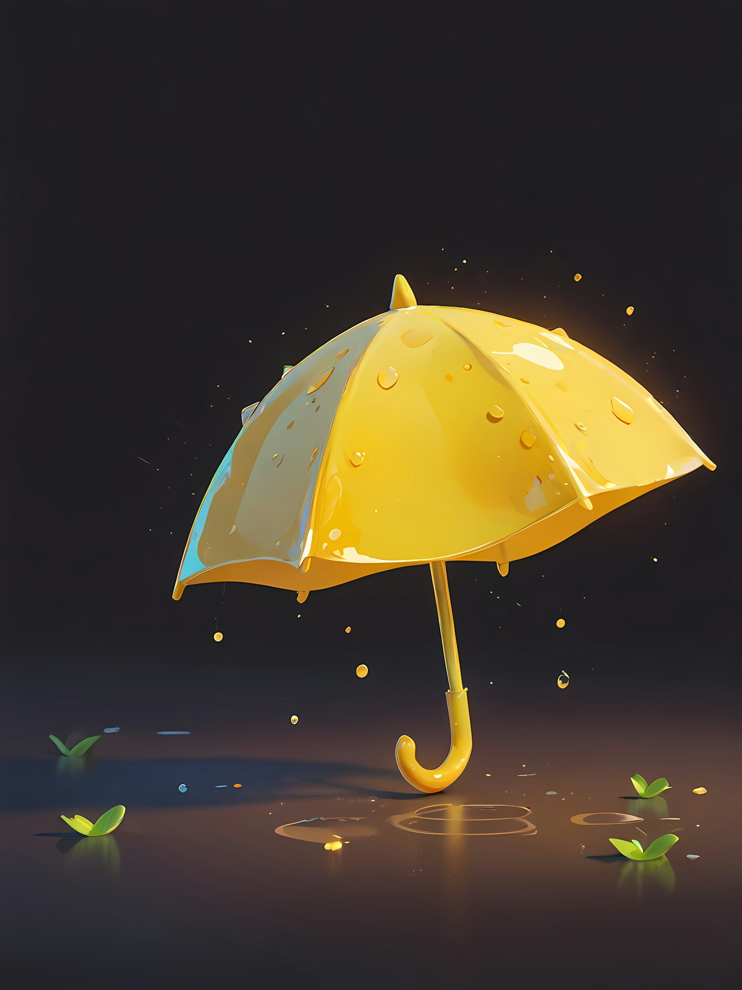 Bright yellow umbrella with water droplets on a dark surface, surrounded by green sprouts and puddles, creating a rainy, fresh vibe.