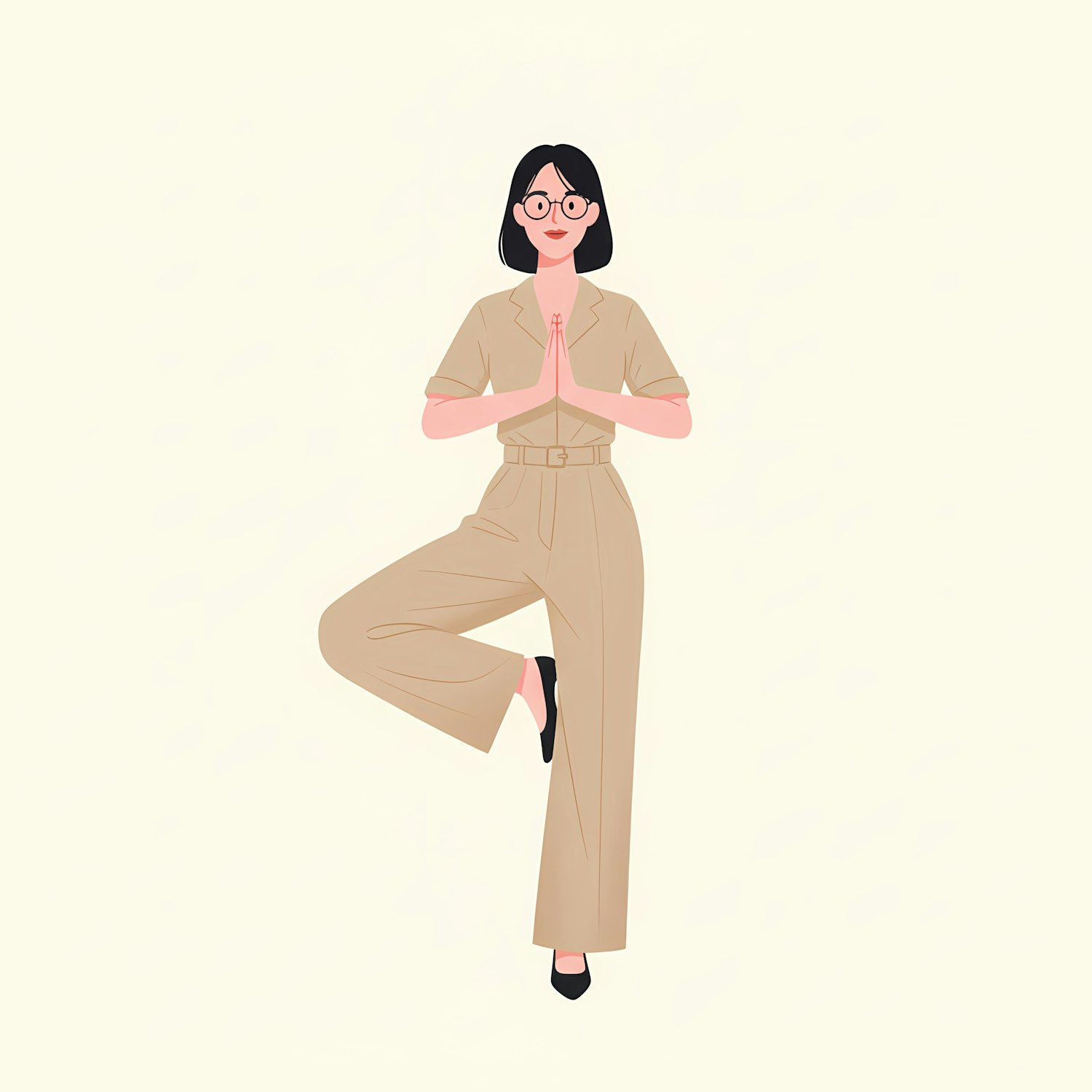 Minimalistic illustration of a person in a yoga tree pose, wearing a beige outfit and glasses, set against a light background.