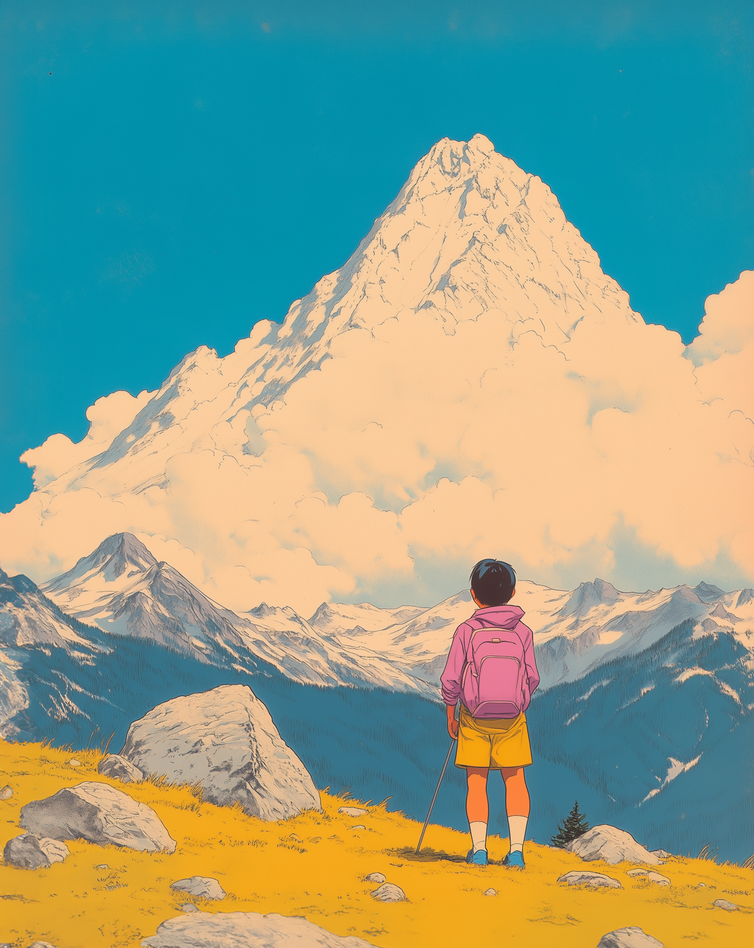 A young hiker with a pink backpack admires a snow-capped mountain under a clear blue sky, surrounded by vibrant yellow grass.