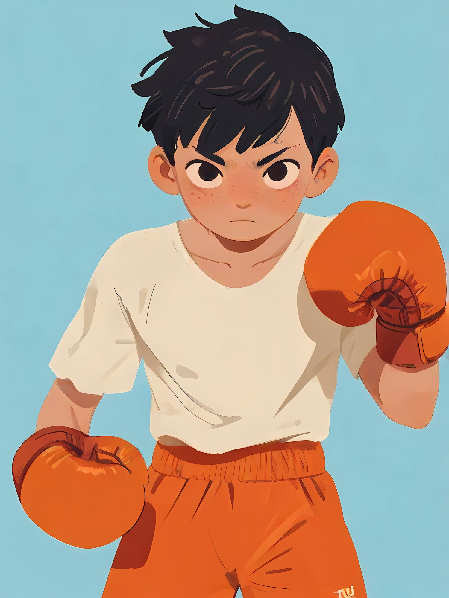 Illustration of a young boy in boxing gear, wearing orange gloves and shorts, with a determined expression against a blue background.