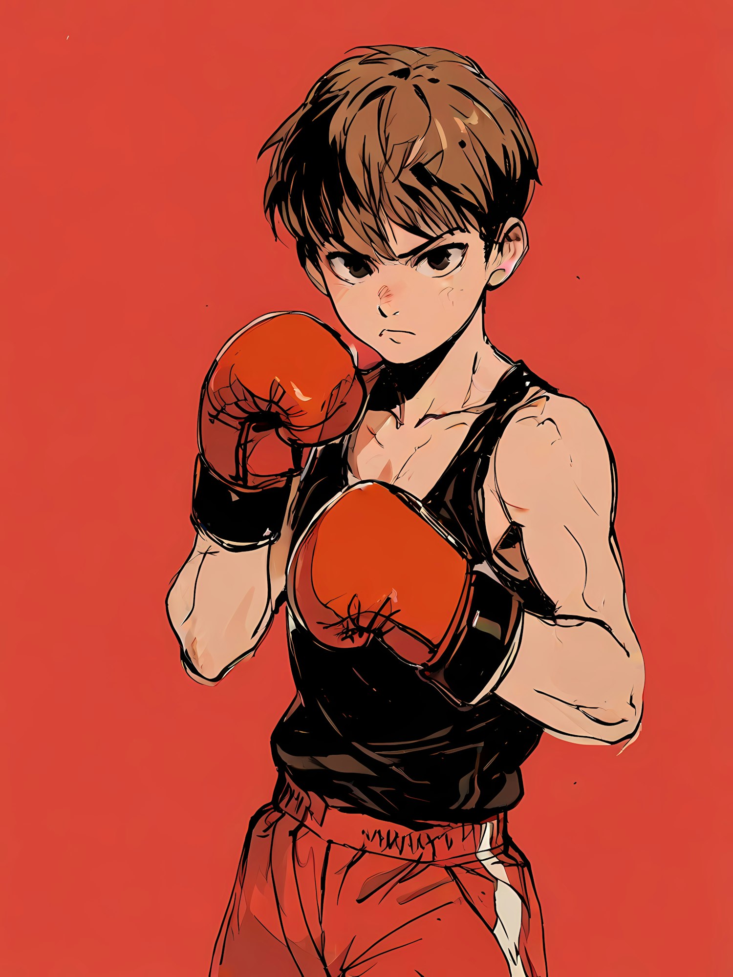 Dynamic illustration of a young boxer with red gloves and a determined expression, set against a bold red background.