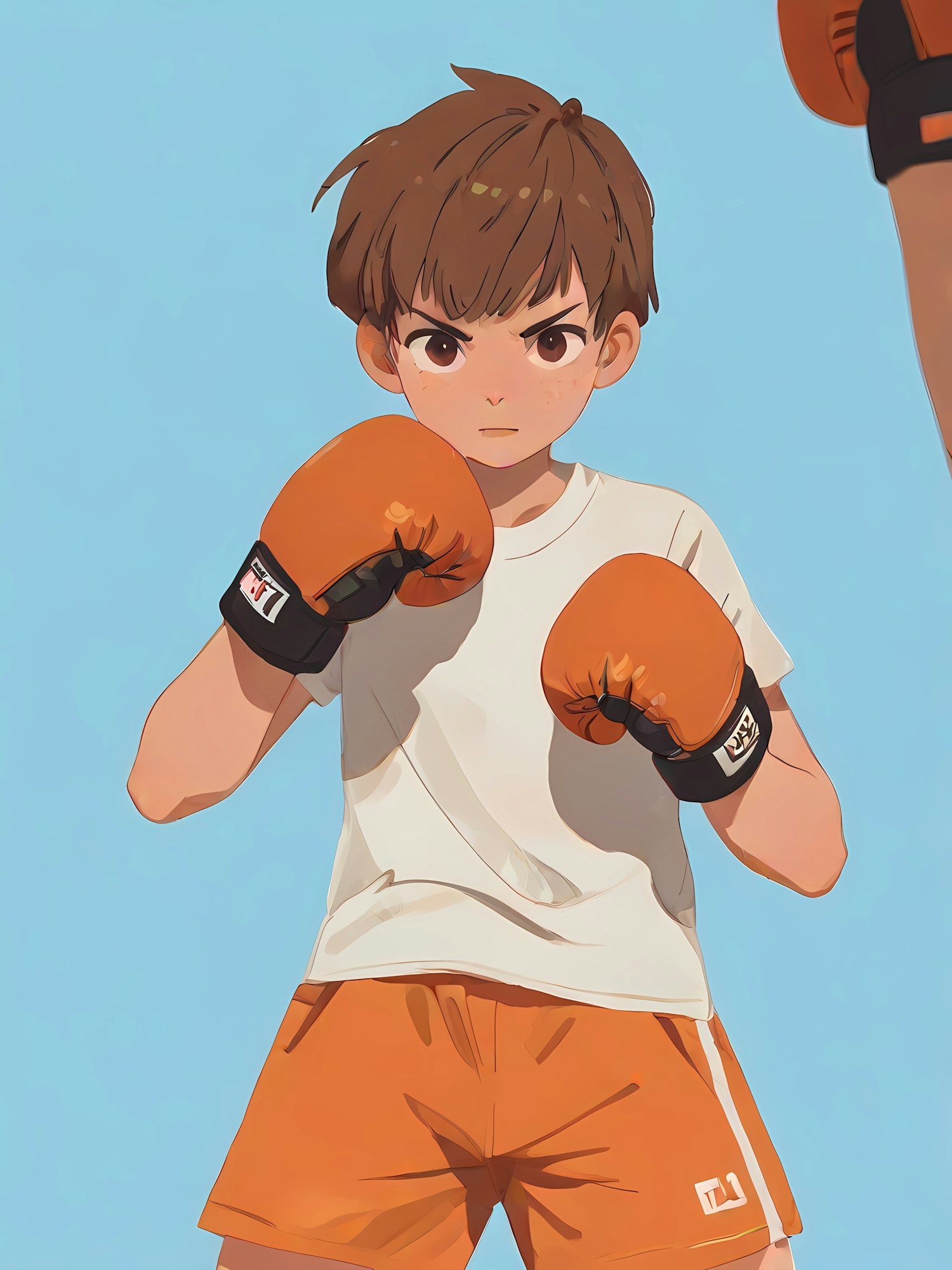 Young boy in boxing stance with orange gloves and shorts, focused expression, against a clear blue sky background.
