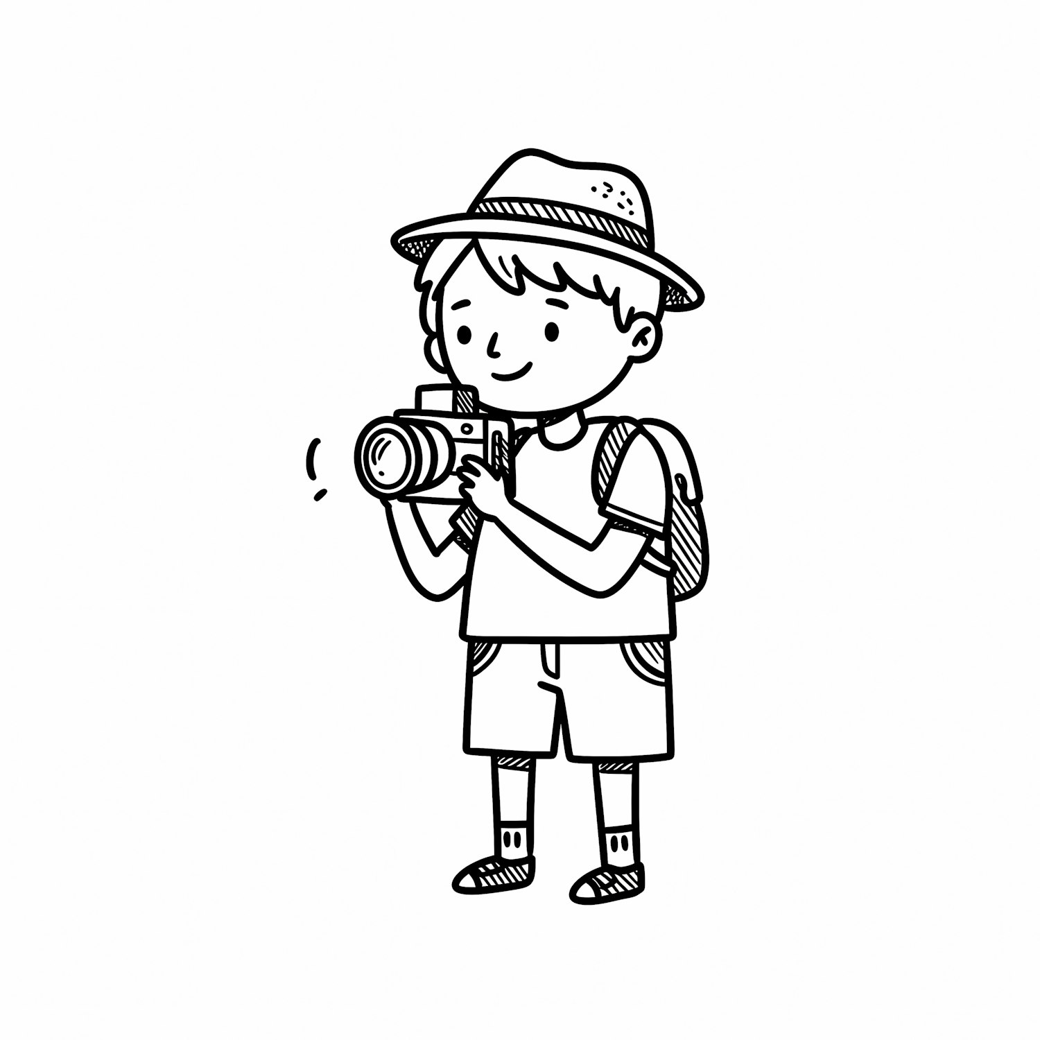 A charming black-and-white illustration of a boy with a camera, wearing a hat and backpack, ready for an adventure.