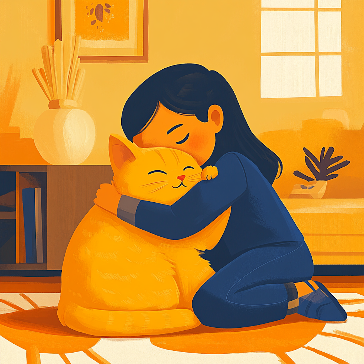 A girl in blue hugs a large orange cat in a warm, cozy room. The illustration exudes affection and comfort.