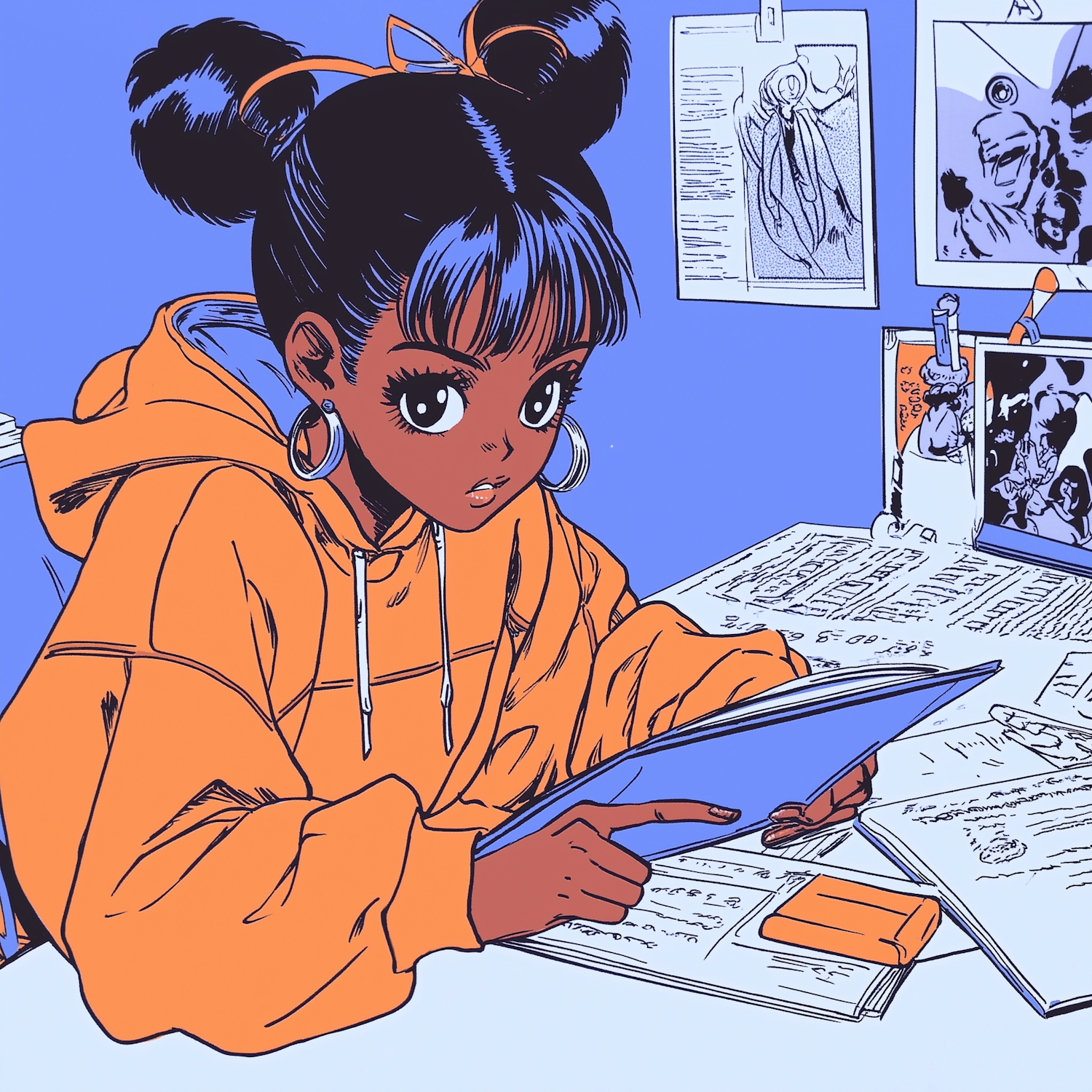 Anime-style illustration of a young girl in an orange hoodie, studying at a cluttered desk with sketches and notes on the wall.