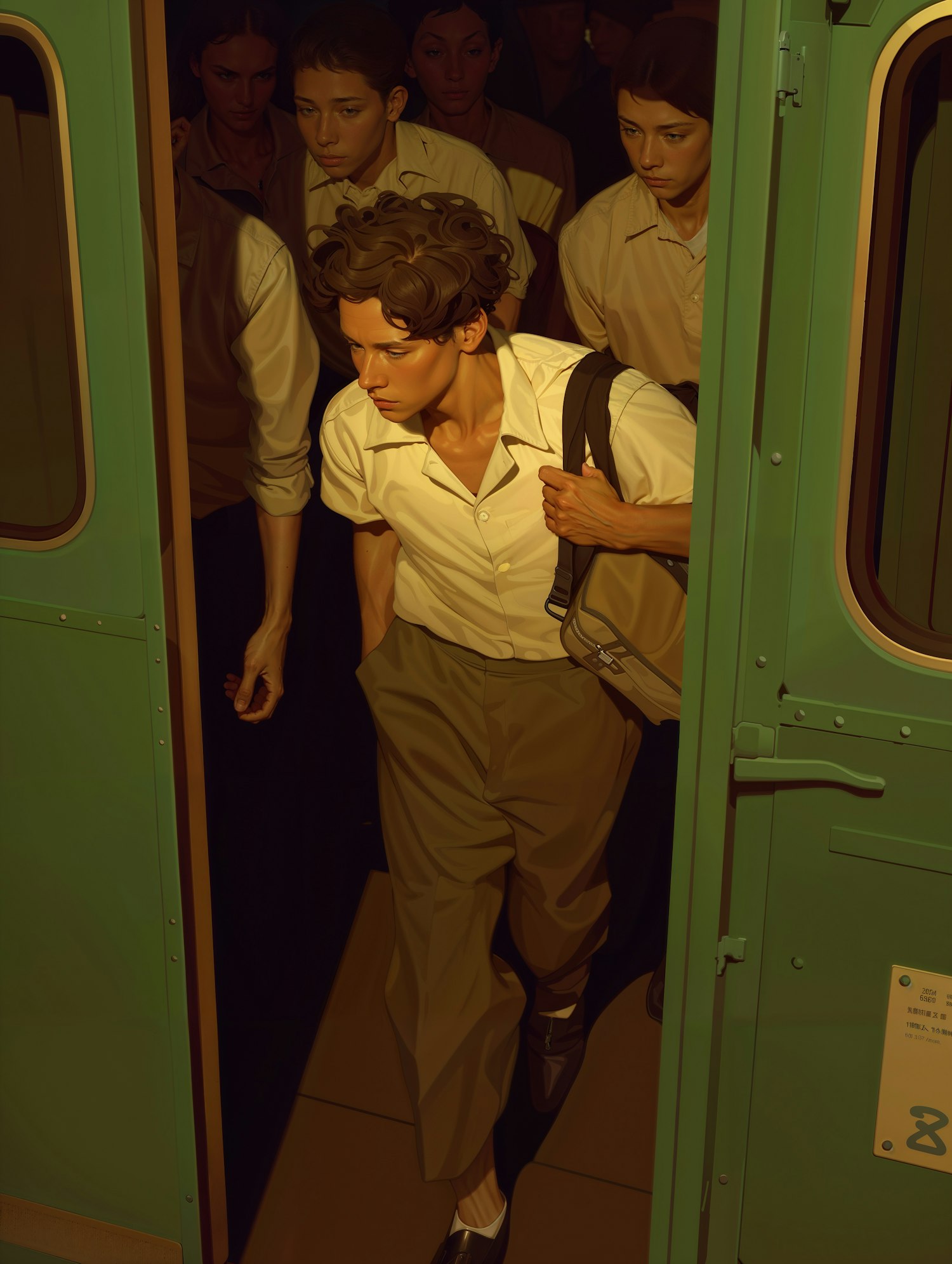 A group of people exits a train, led by a young man with curly hair and a backpack, under dramatic lighting and shadows.