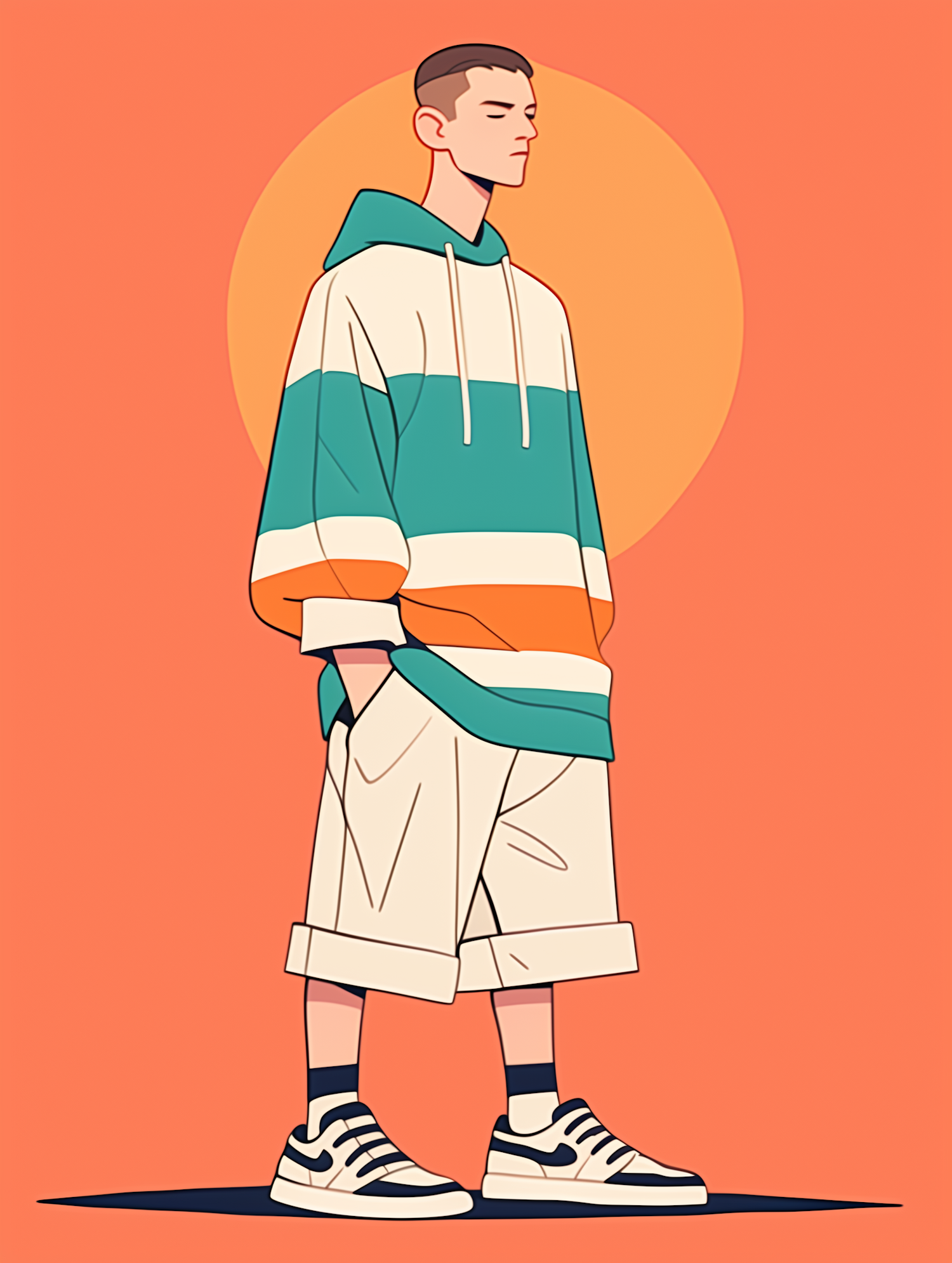 Stylized illustration of a young man in a striped hoodie and shorts, set against a vibrant orange background.