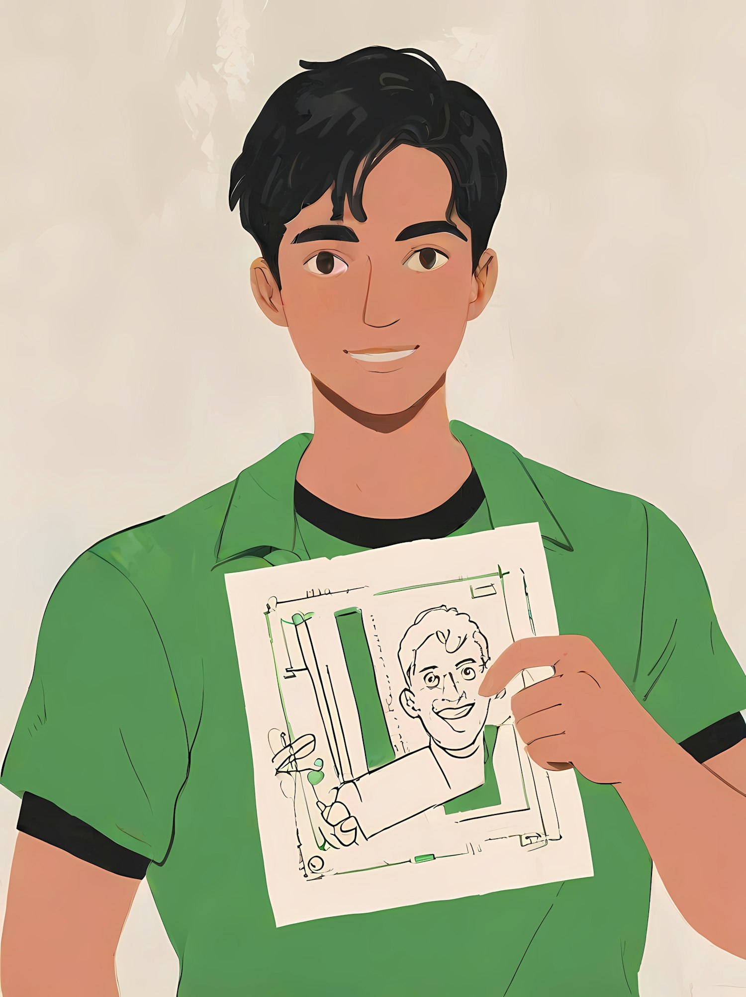 Young man in green shirt holding a sketch of a cartoon face, smiling warmly. Creative and cheerful illustration.