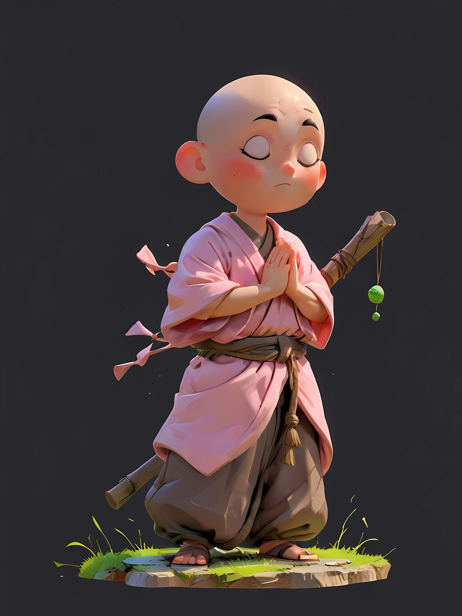 Adorable 3D monk character in pink robes, holding a staff with a green bead, standing on grass with a serene expression.