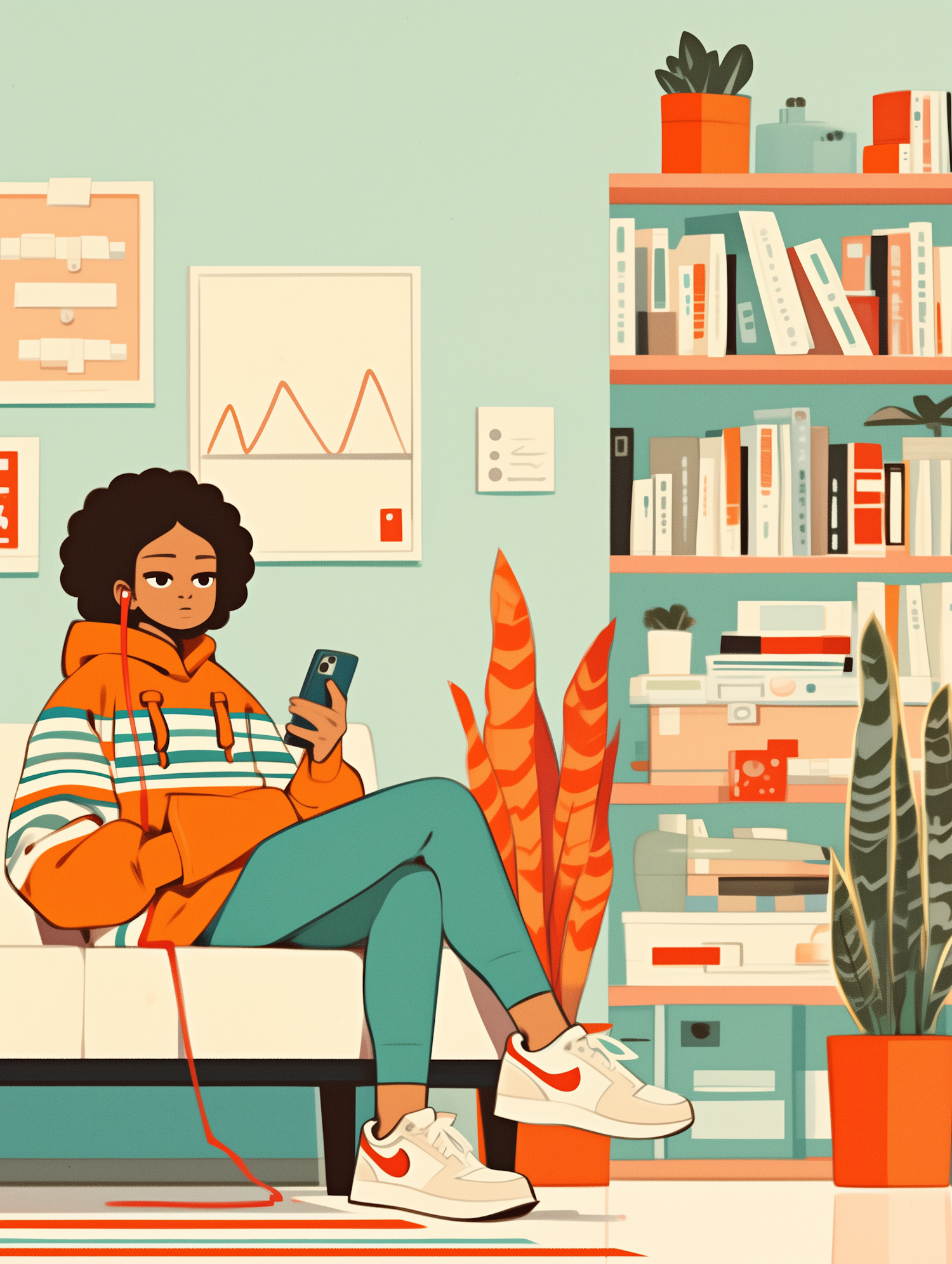 Young woman in cozy room with books, plants, and charts, wearing an orange hoodie and listening to music on her phone.