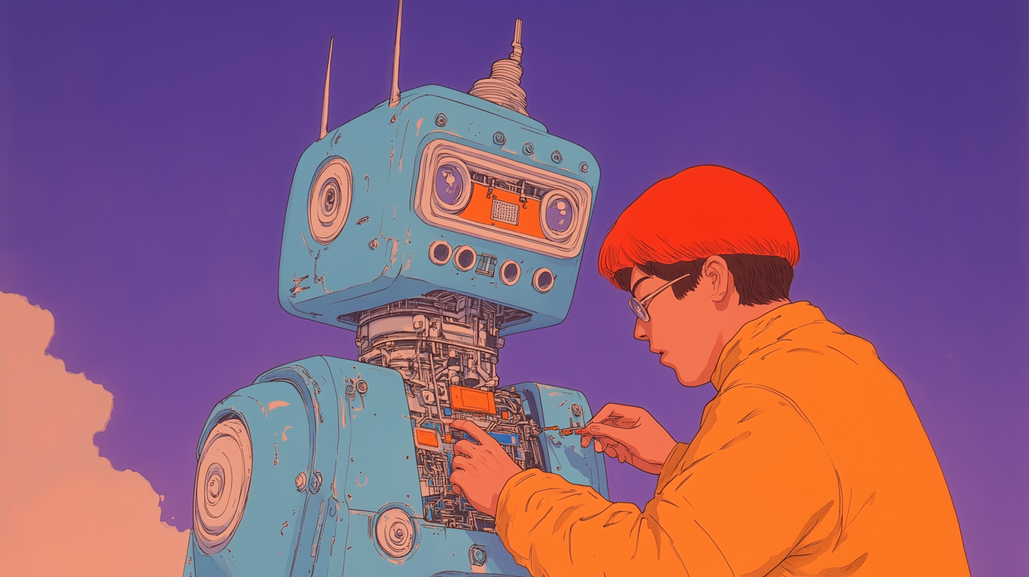 A young man repairs a retro blue robot against a vibrant purple and orange sky, highlighting a blend of technology and creativity.