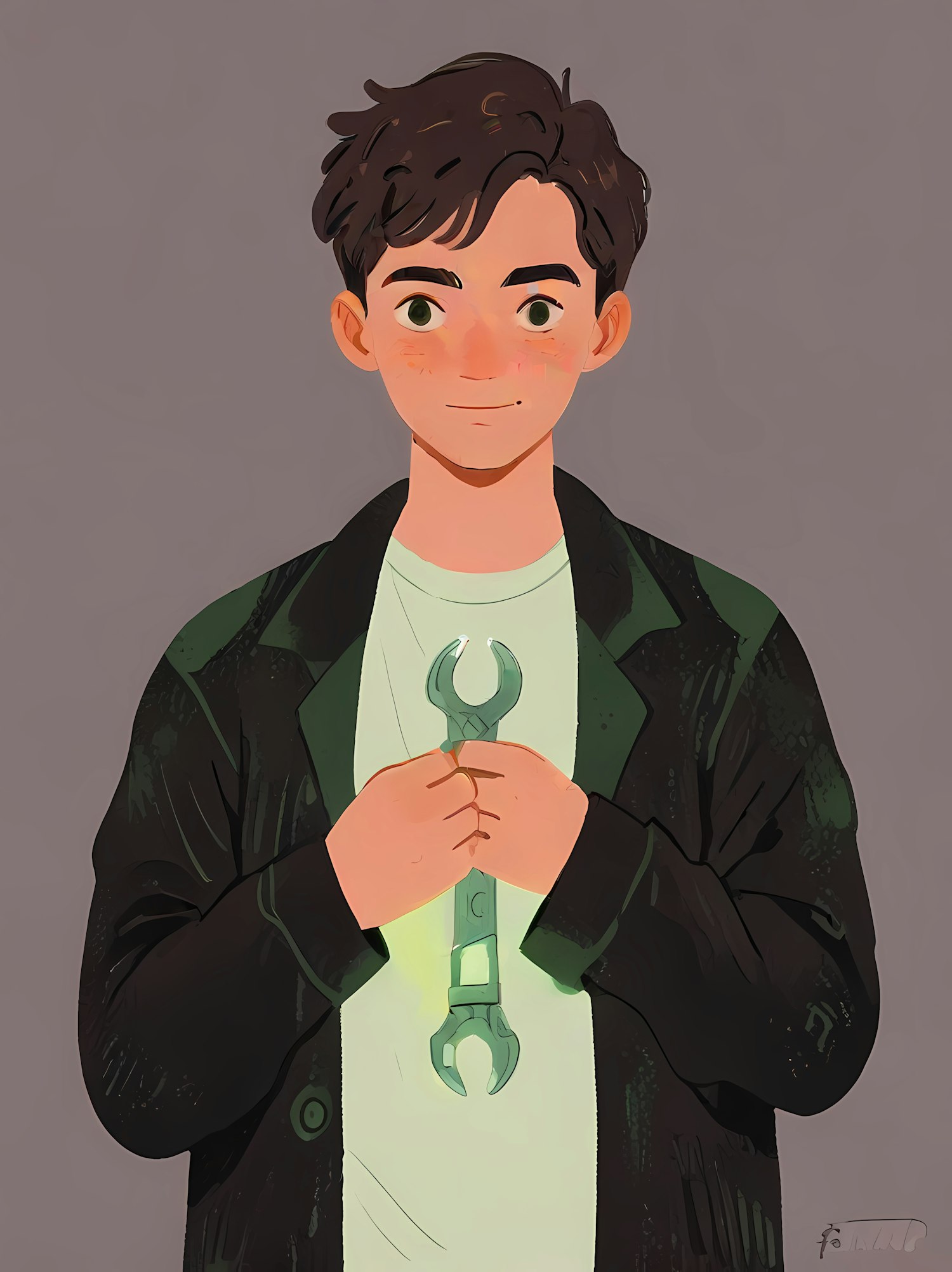 Illustration of a young man holding a glowing wrench, wearing a dark green jacket and light green shirt, with a calm expression.