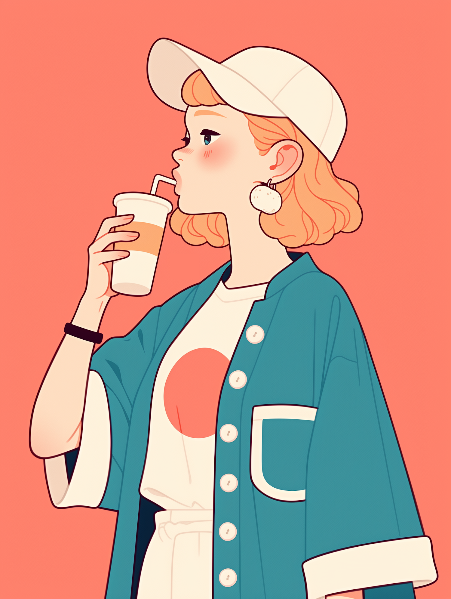 Stylized illustration of a young woman with orange hair sipping a drink, wearing a teal shirt and white cap against a peach background.