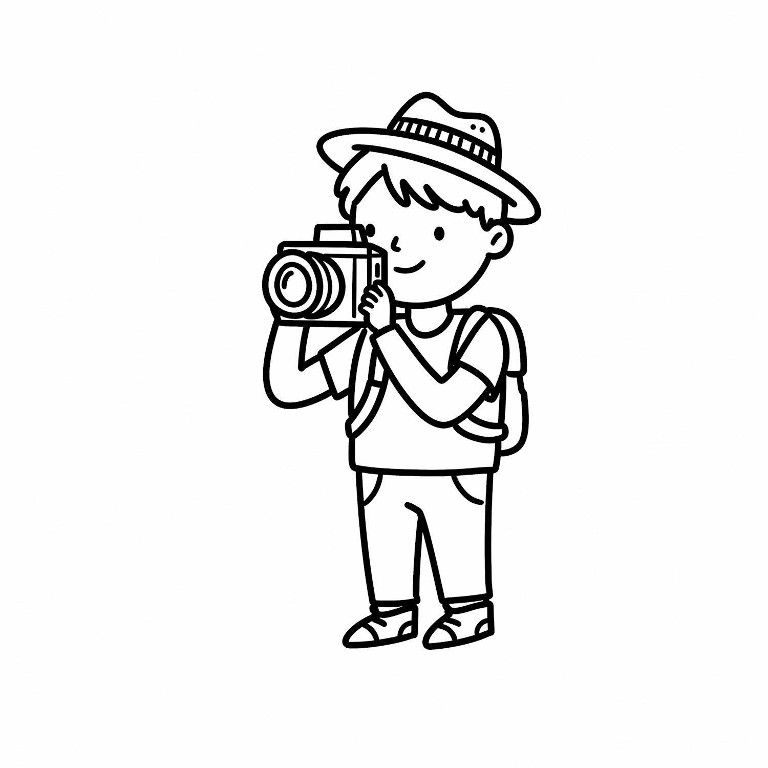 Line art of a cheerful young person with a camera, wearing a hat and backpack, perfect for coloring or educational activities.