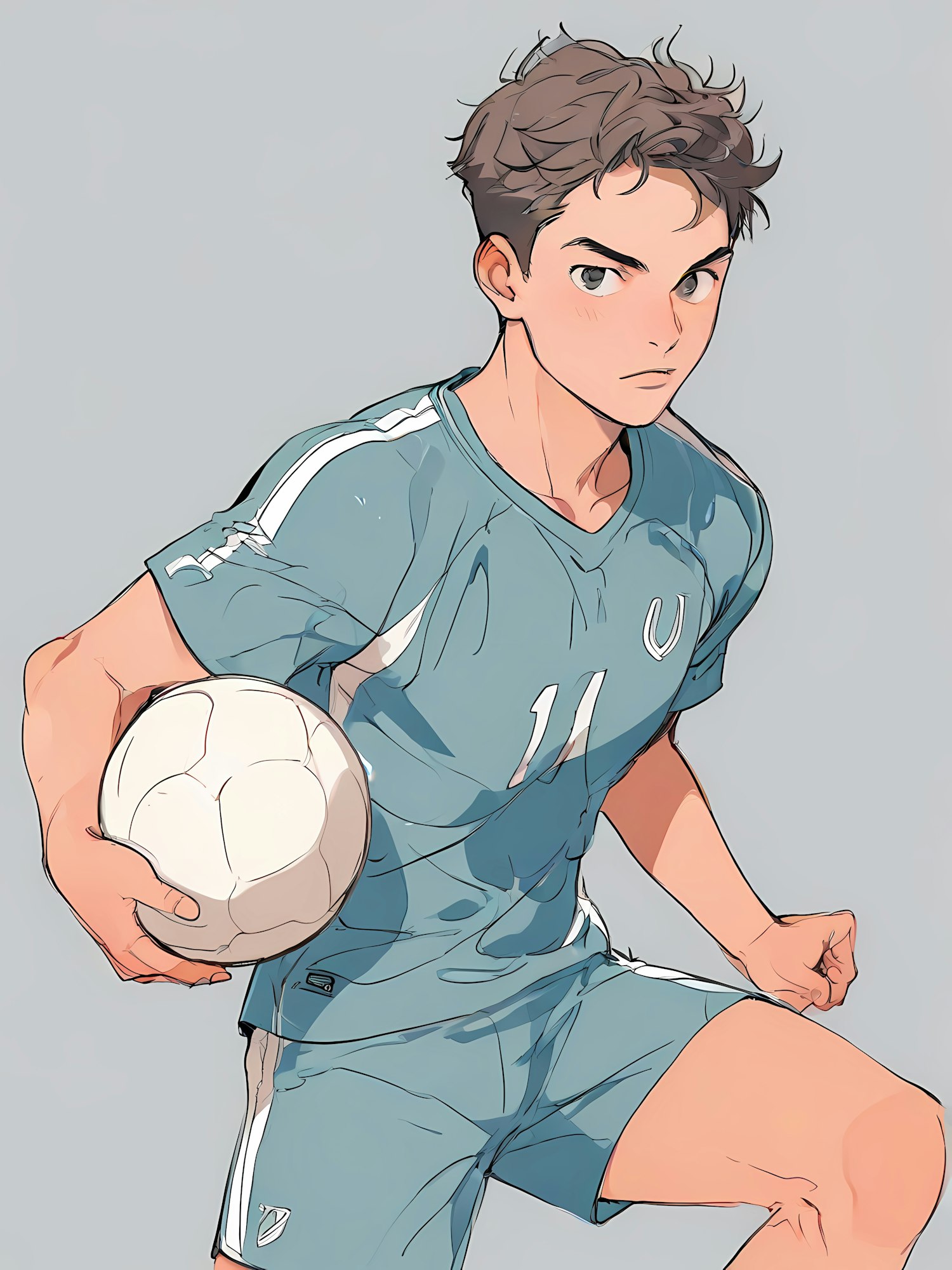 Dynamic illustration of a young soccer player in a light blue uniform holding a ball, exuding determination and focus.