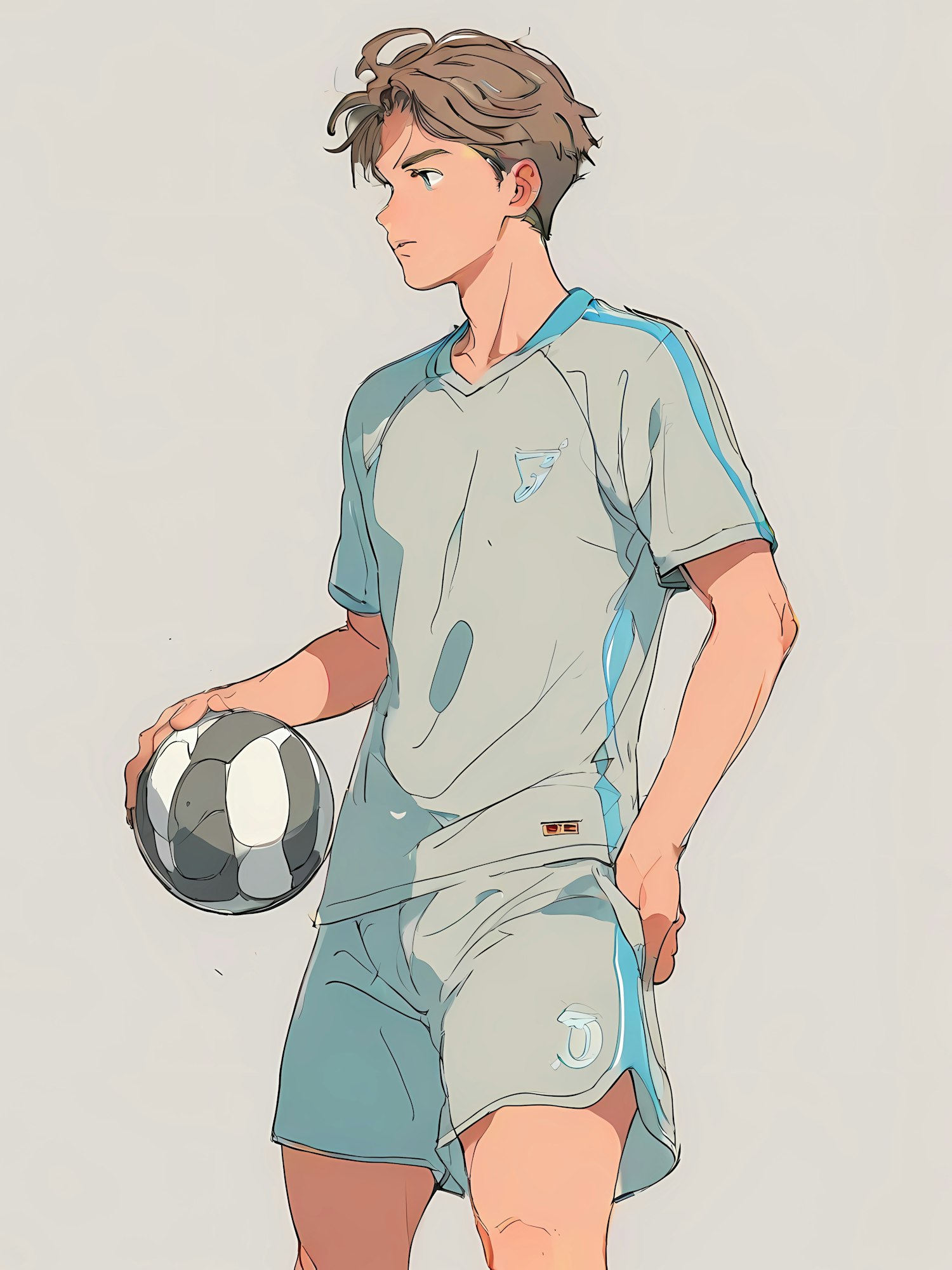 Stylized illustration of a young soccer player in a gray and blue uniform, holding a soccer ball with a focused expression.