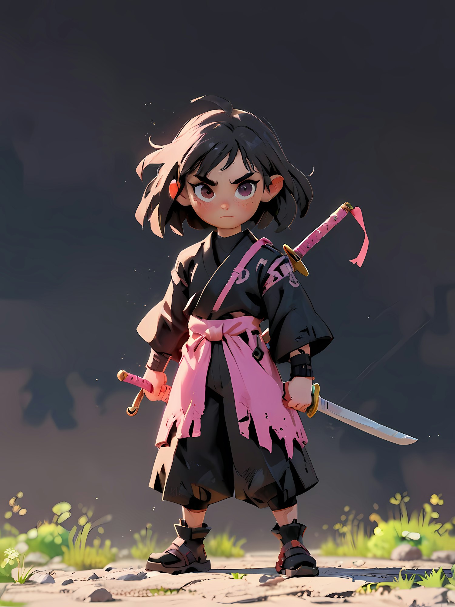 Stylized young warrior with a katana, wearing a black outfit with pink accents, standing confidently against a muted background.