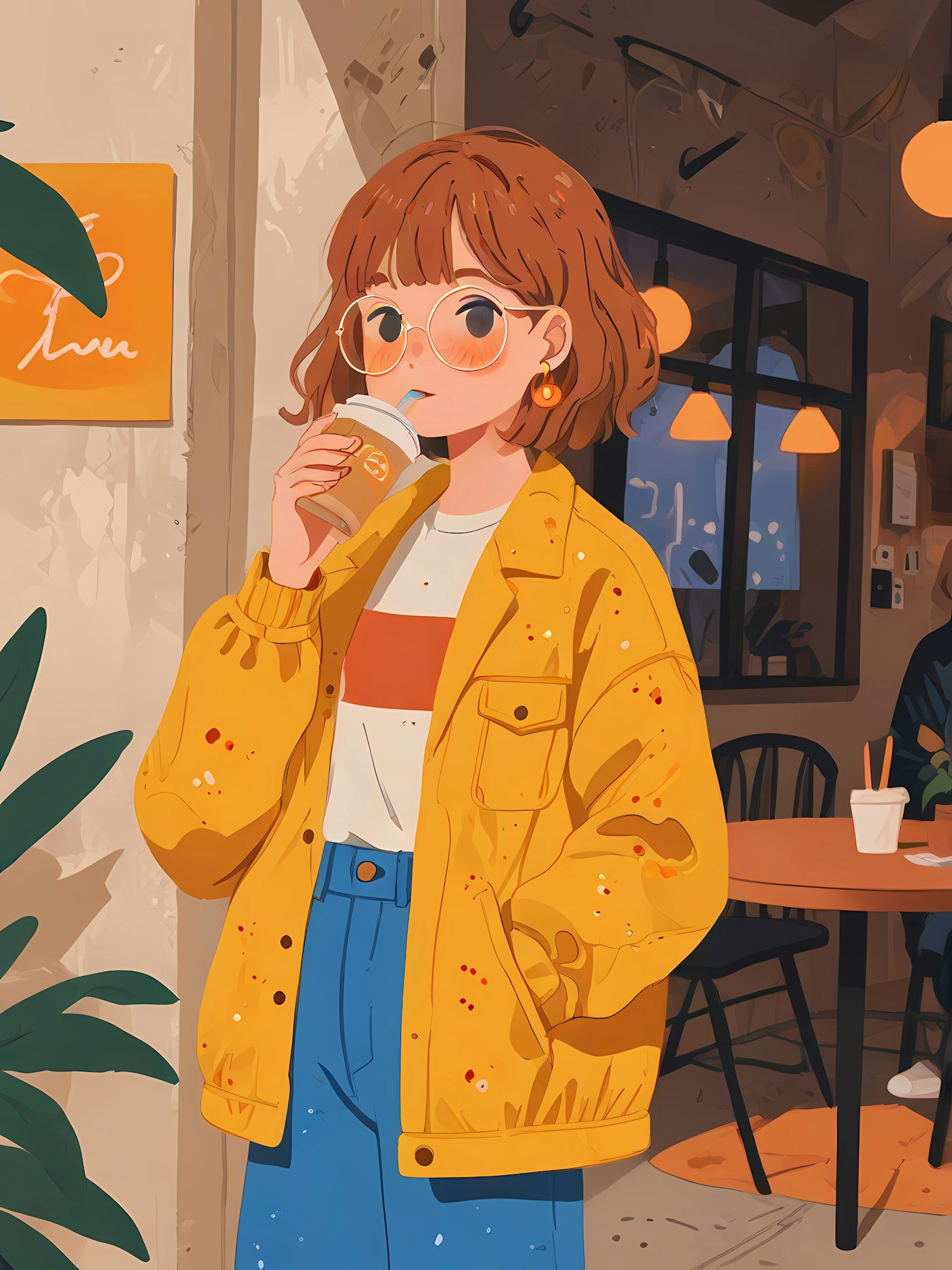 Charming illustration of a young woman in a yellow jacket sipping a drink in a cozy cafe setting.