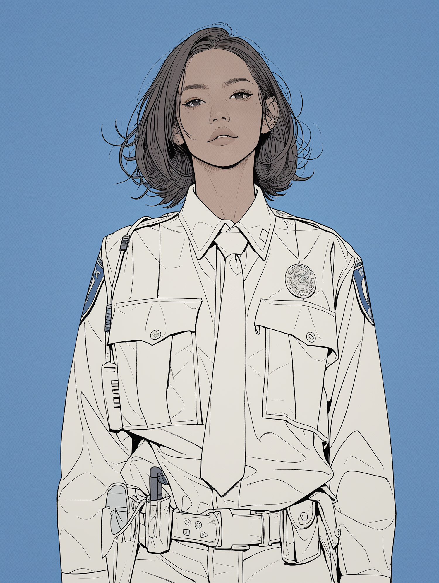 Illustration of a confident young woman in a police uniform with a calm expression, set against a blue background.