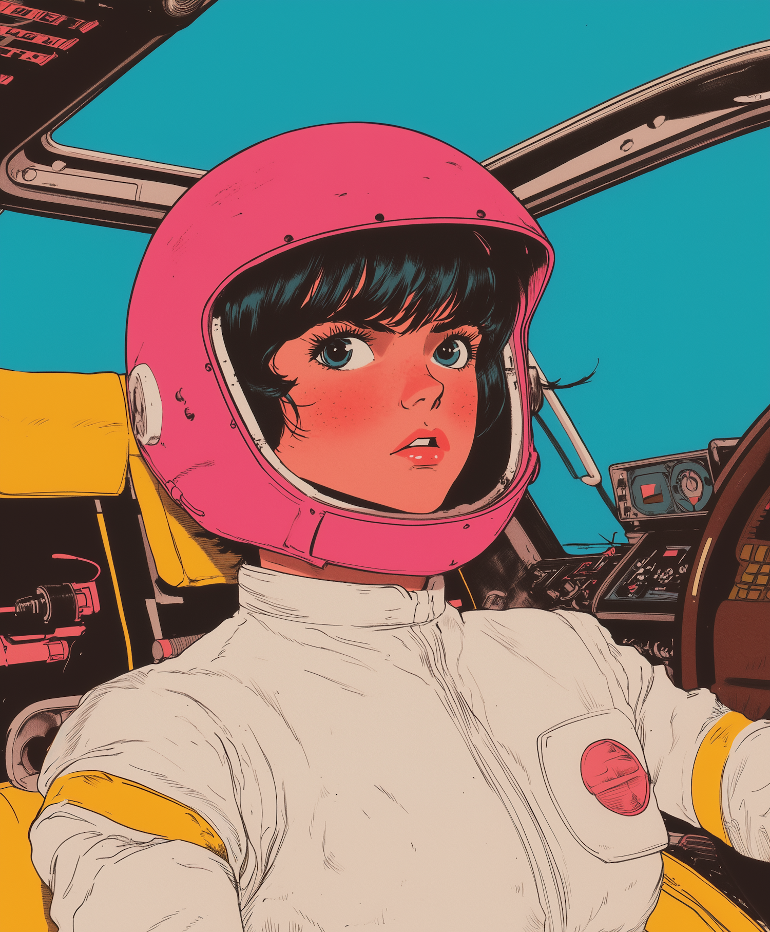 Stylized illustration of a woman in a pink helmet and space suit in a futuristic cockpit, set against a bright blue background.