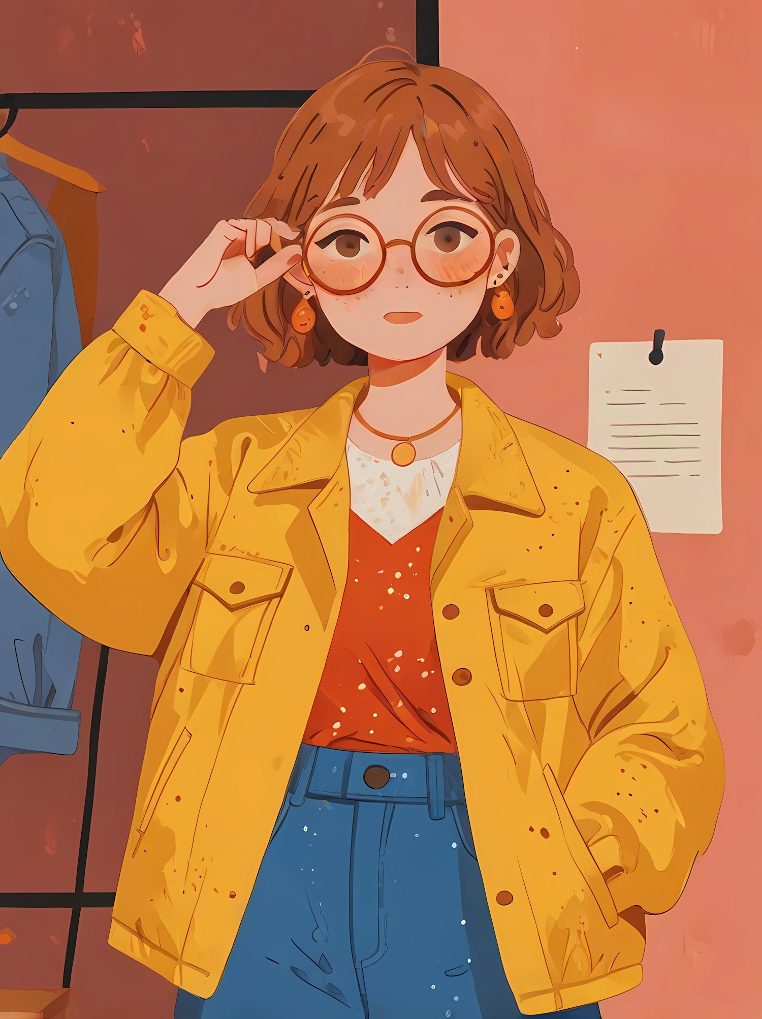 Illustration of a young woman in a yellow jacket and glasses, set against a warm peach background with a paper on the wall.