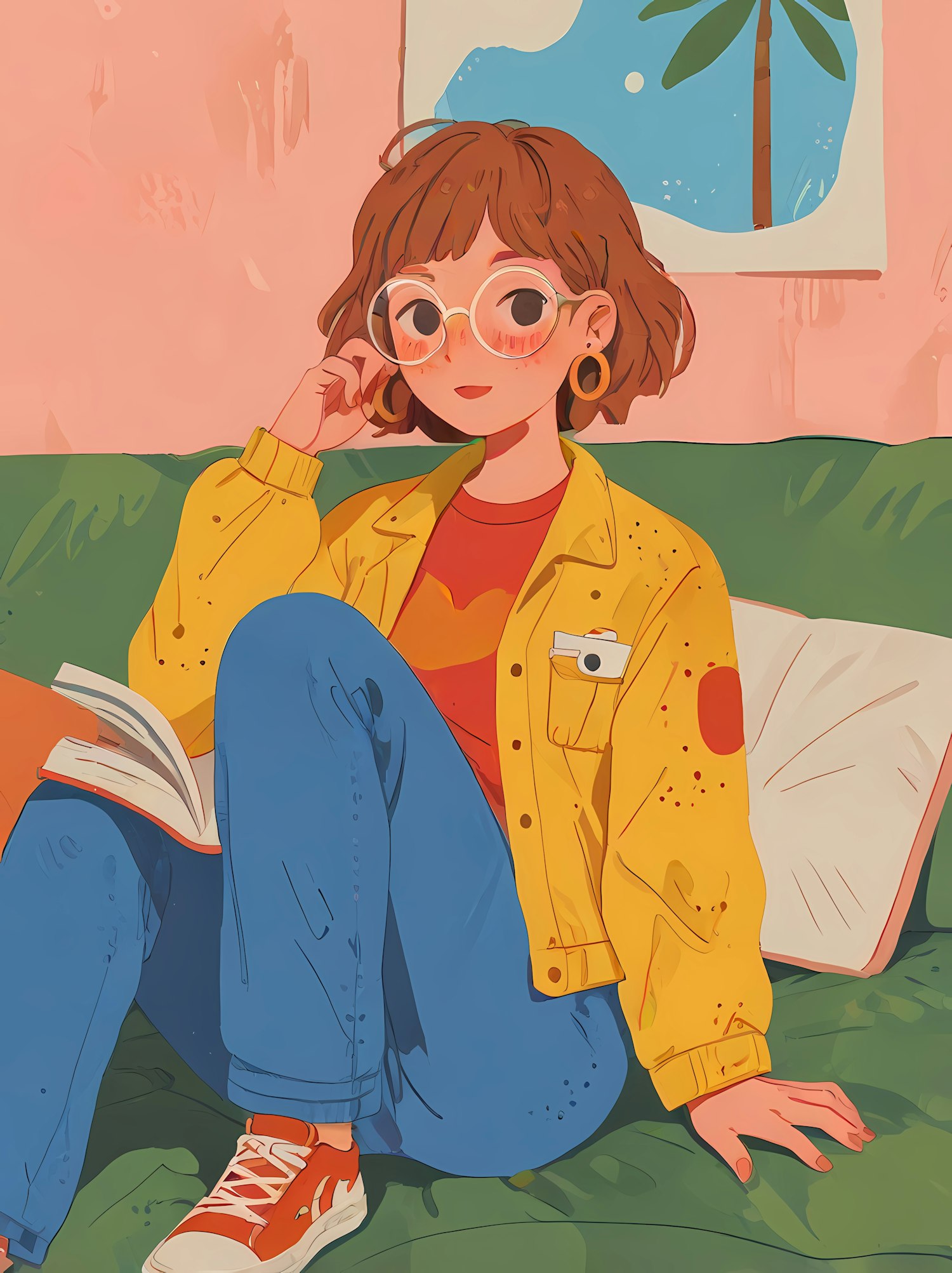 Charming illustration of a young woman reading on a couch, wearing a yellow jacket and glasses, with a pastel pink background.