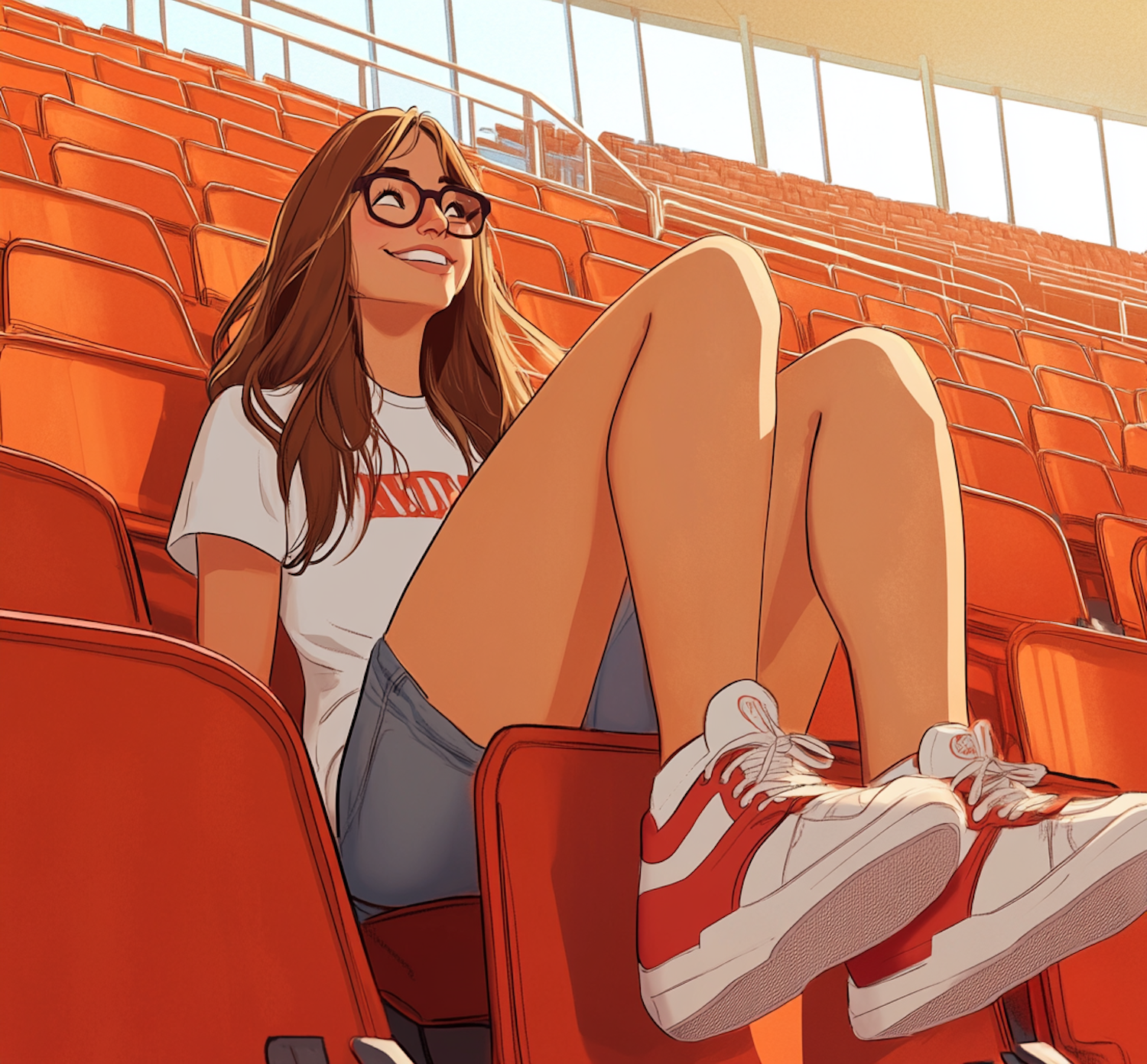 Young woman with glasses smiling in an empty stadium, wearing a white t-shirt and denim shorts, sitting on orange seats.