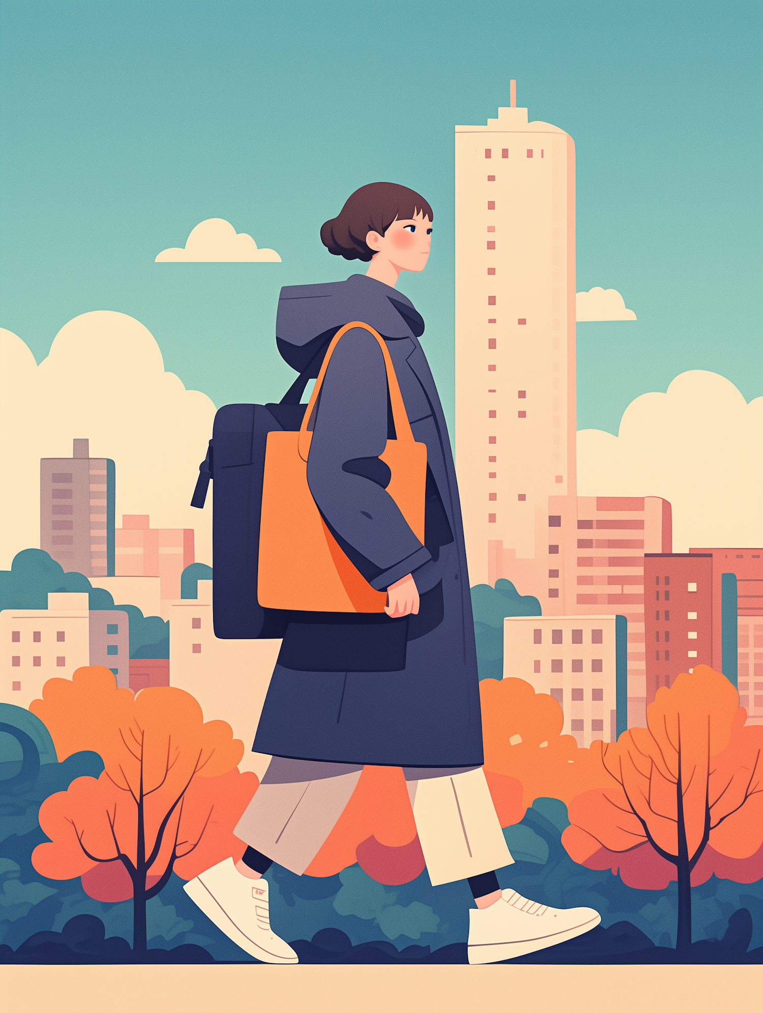 Stylized illustration of a person walking in a city with autumn trees and tall buildings, carrying an orange bag and wearing a blue coat.