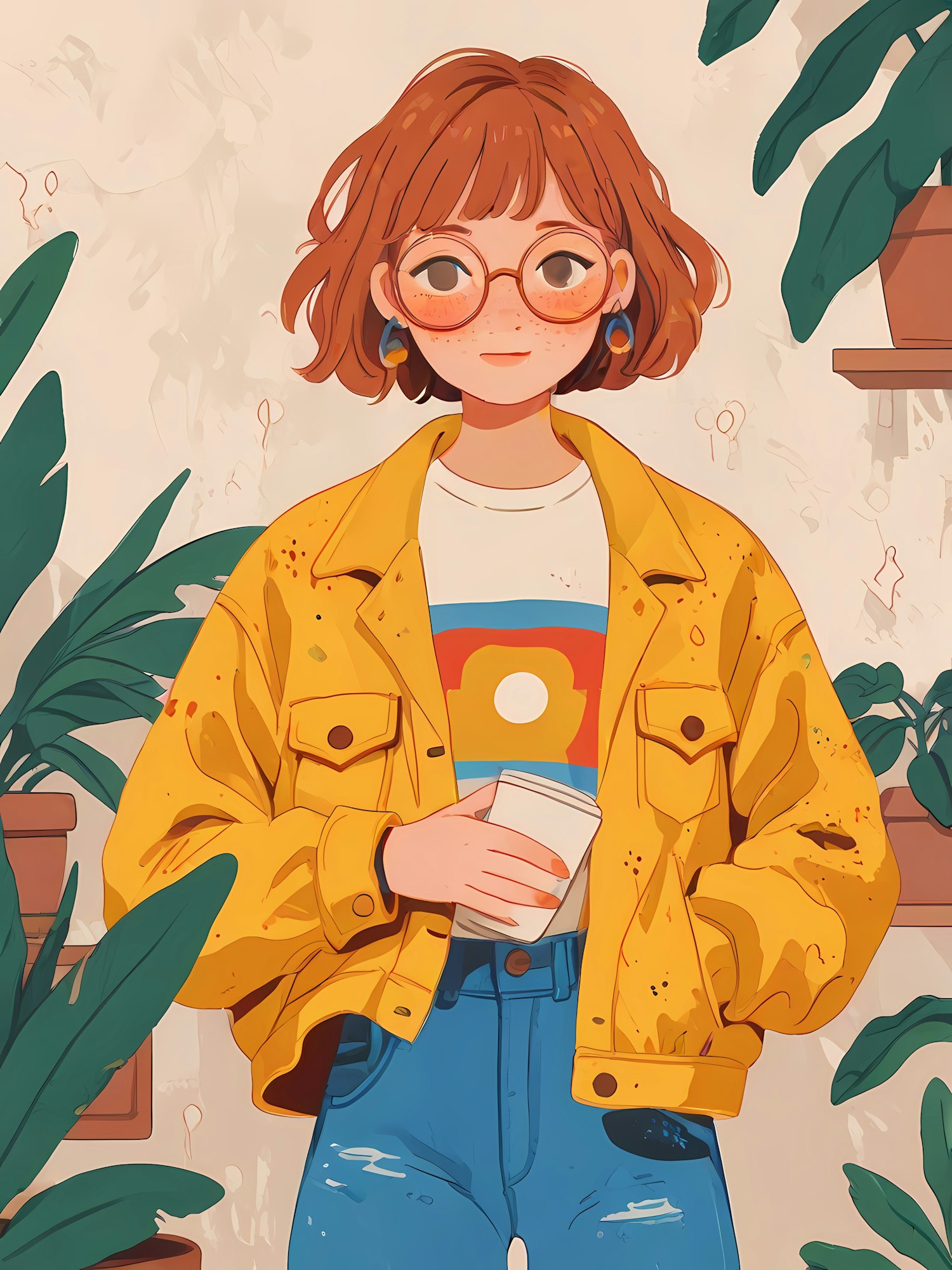 Illustration of a young woman with auburn hair, yellow jacket, and glasses, holding a cup amidst lush green plants.